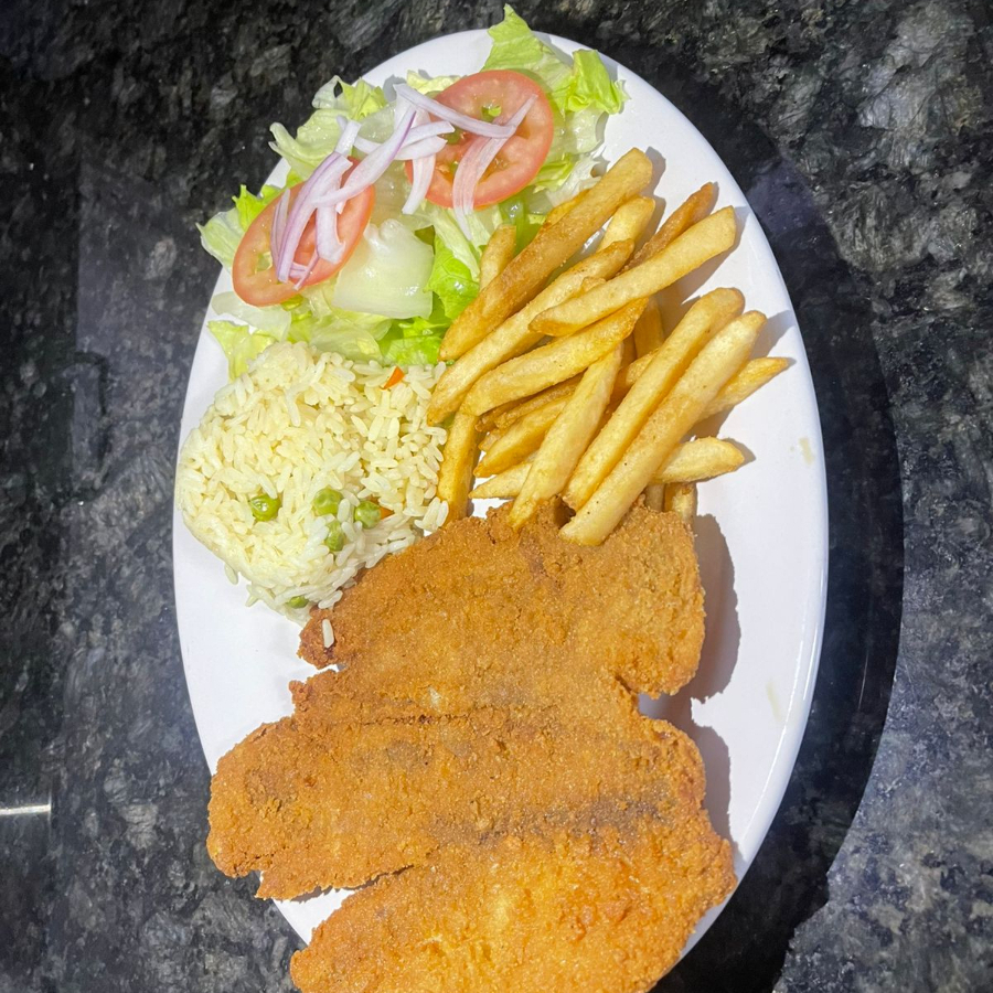 Pescado empanizado, lechuga tomate y aderezo de la casa.