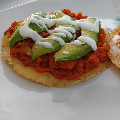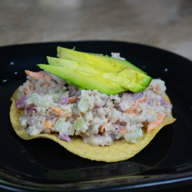 Tostada con sierra curtida en limon acompañada de cebolla, pepino y zanahoria aderezada con mayonesa.