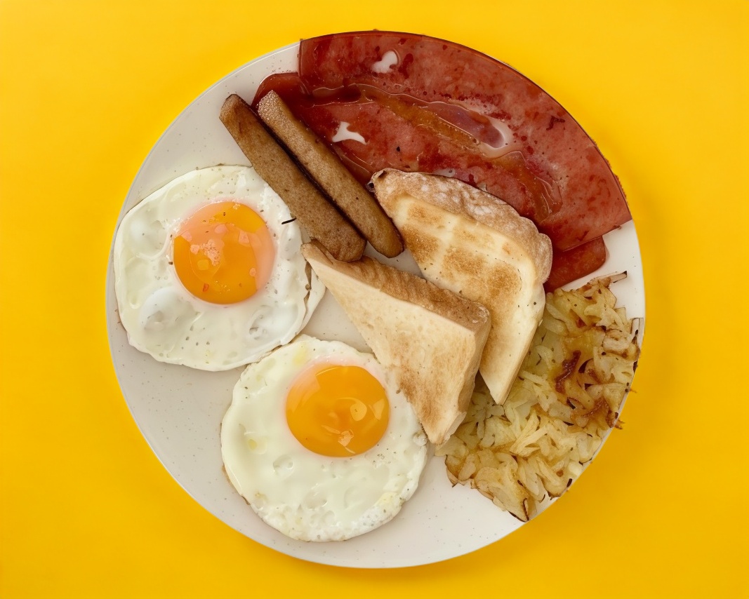 2 Piezas de huevo, elección entre tocino o salchicha de puerco, papa rallada y pan tostado.