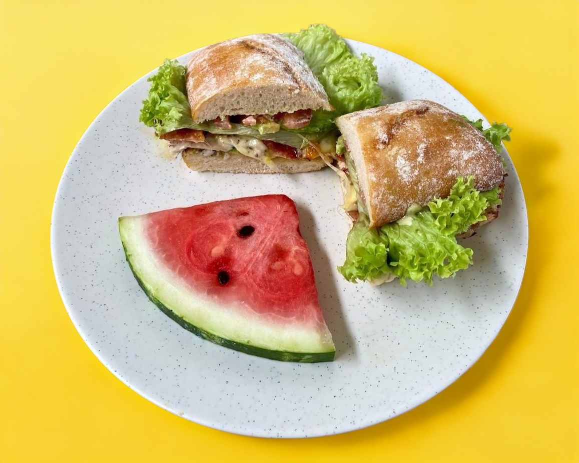 Pan ciabatta, queso crema, pechuga de pavo, queso manchego, lechuga, tomate, aguacate, cebolla y pimiento morrón.
