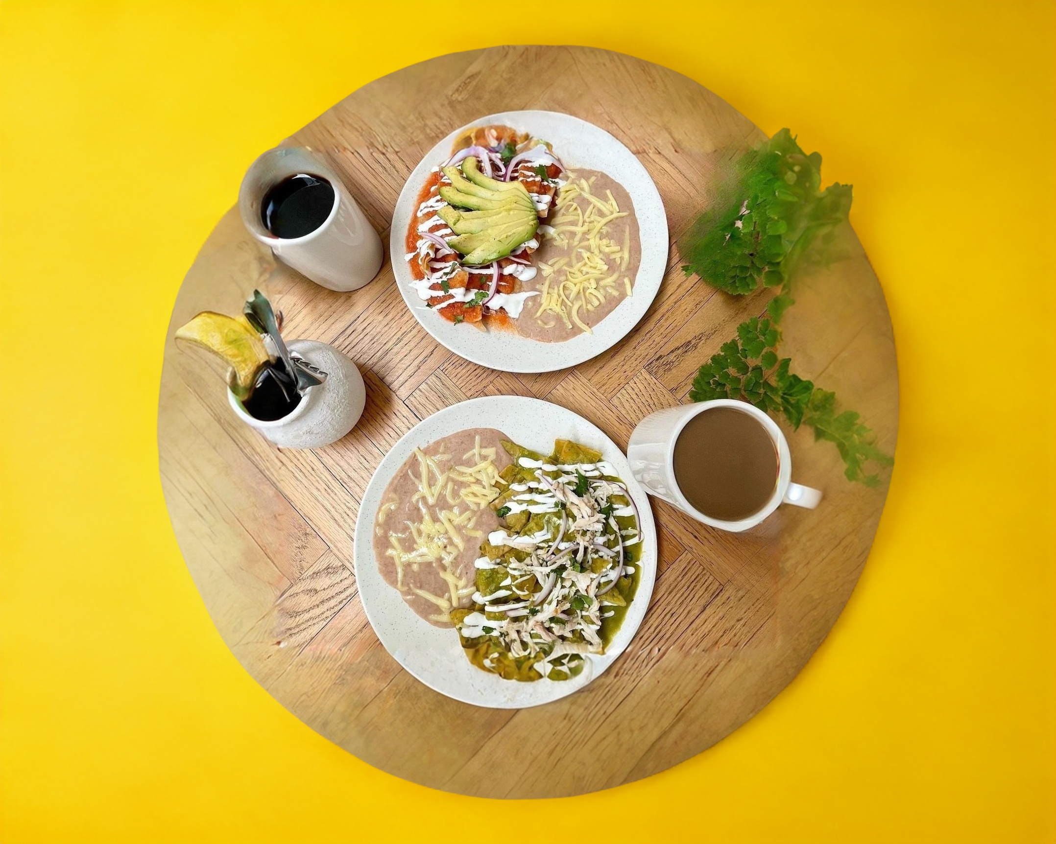 Nuestros deliciosos chilaquiles en salsa roja o verde y frijoles envuelto en una tortilla de harina empapada de la salsa de tu elección con crema y cebolla.