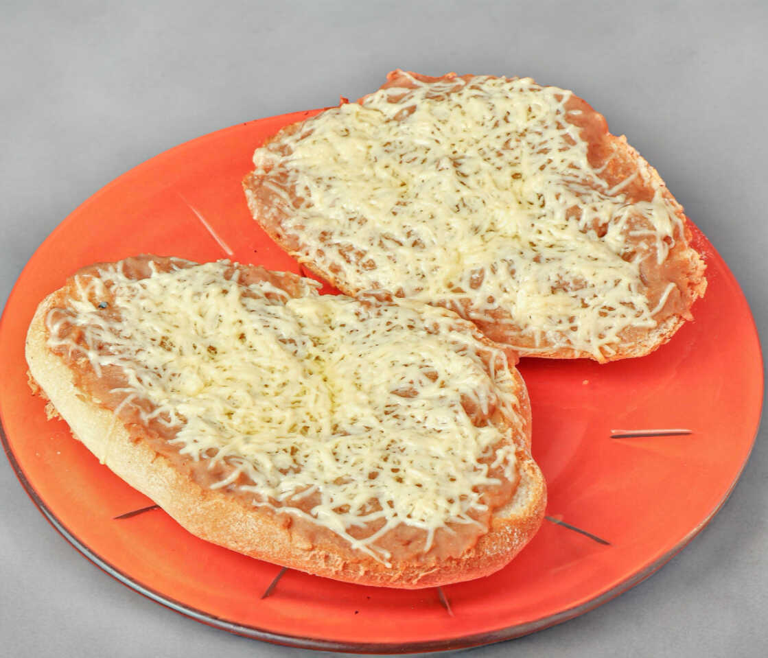 Pan blanco tostado con frijoles refritos y queso chihuahua.