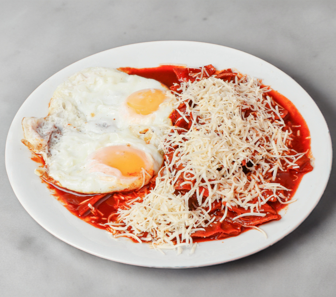 Huevos revueltos o estrellados sobre chilaquiles en salsa de su preferencia con pechuga de pollo desmenusada, crema y queso tipo chihuahua, acompañado de frijoles refritos.