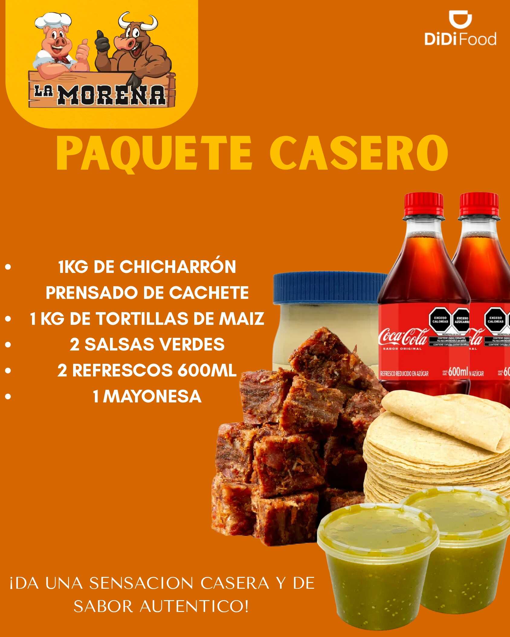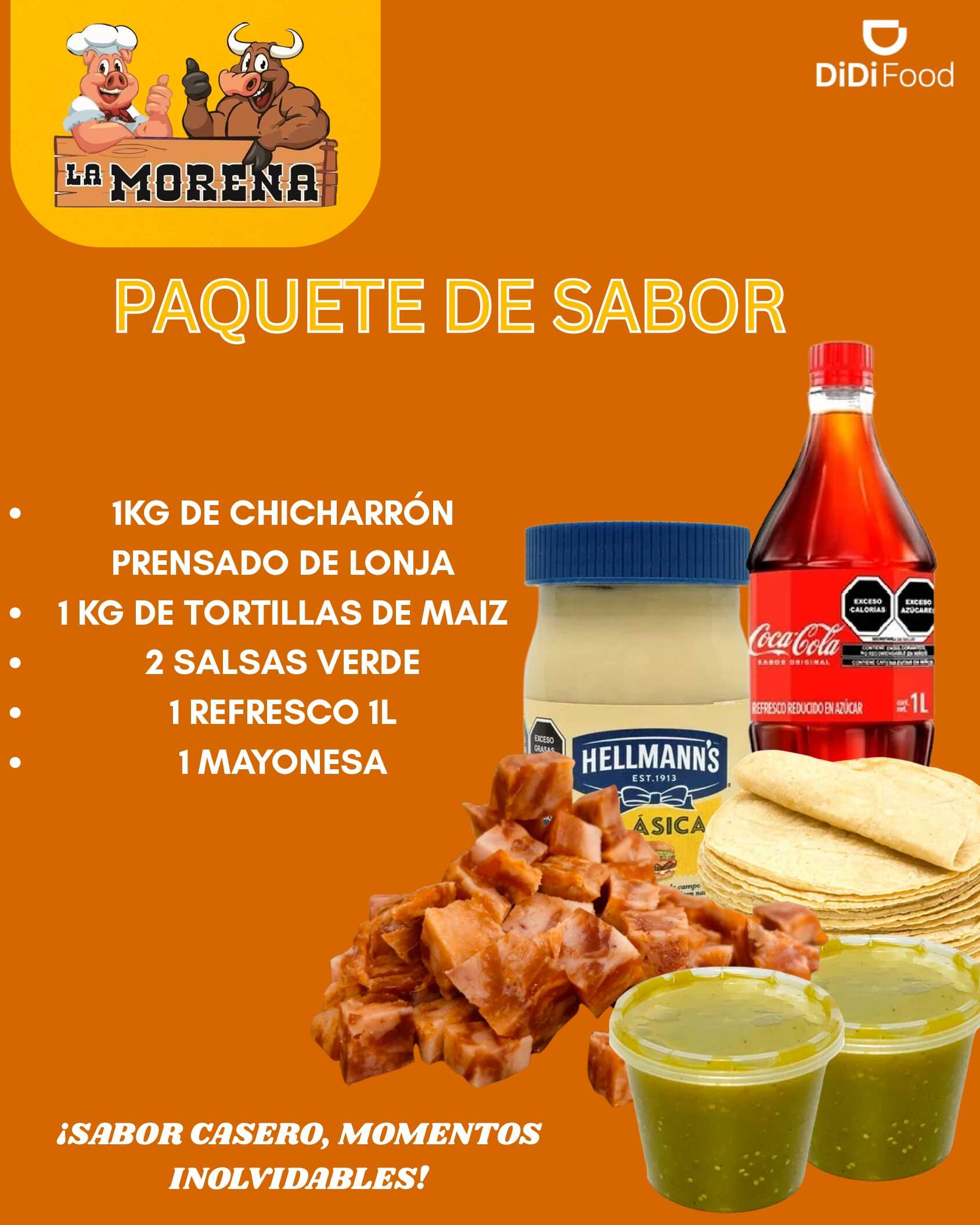 1 Kilo de Chicharrón Prensado de Cachete + 1 Kilo de Tortilla de Maíz + 2 Salsas Verdes + 2 Refrescos de 600 ML + 1 Mayonesa