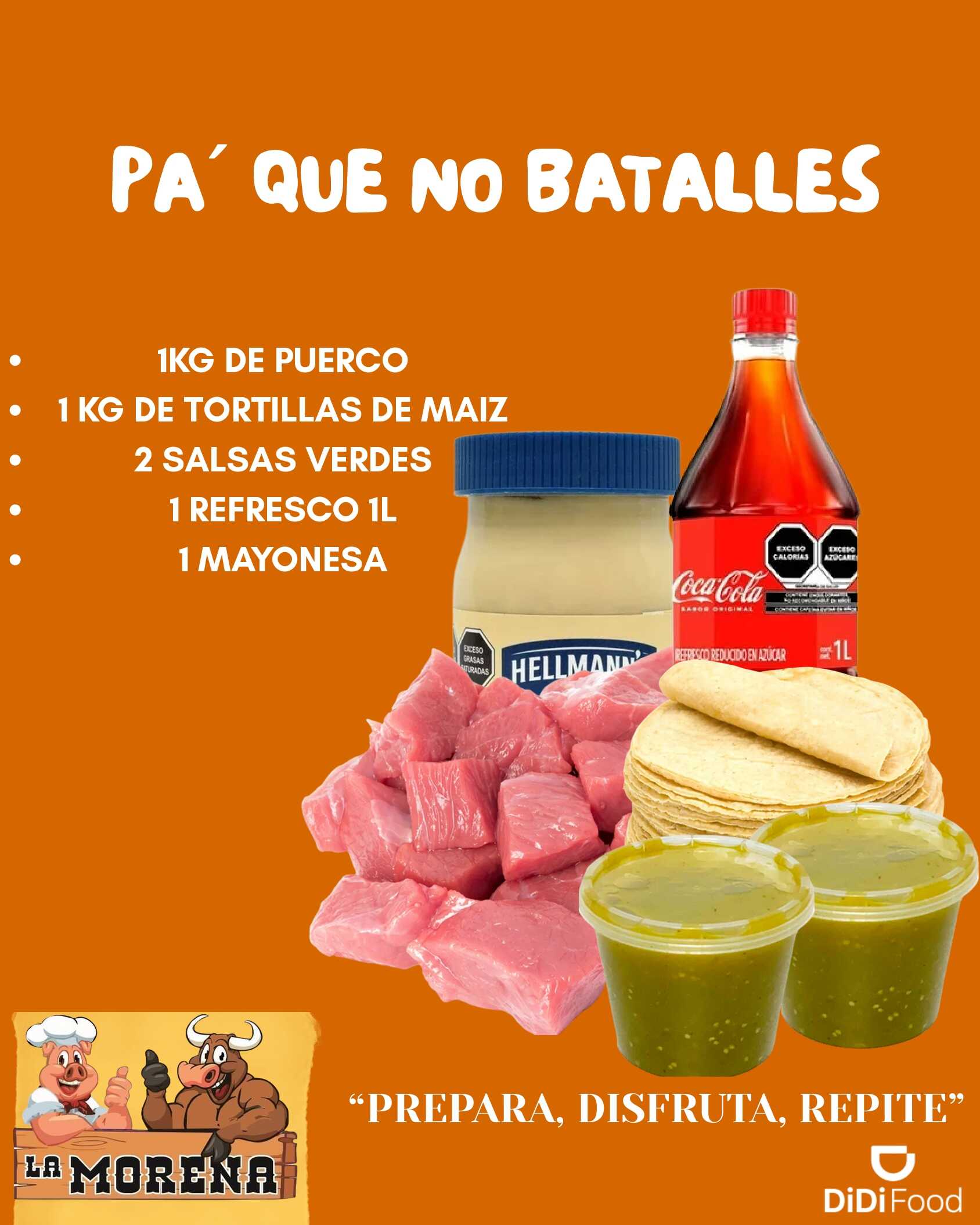 1 Kilo de Carne de Puerco (Cruda) + 1 Kilo de Totillas de Maíz + 1 Refresco de Litro + 1 Mayonesa