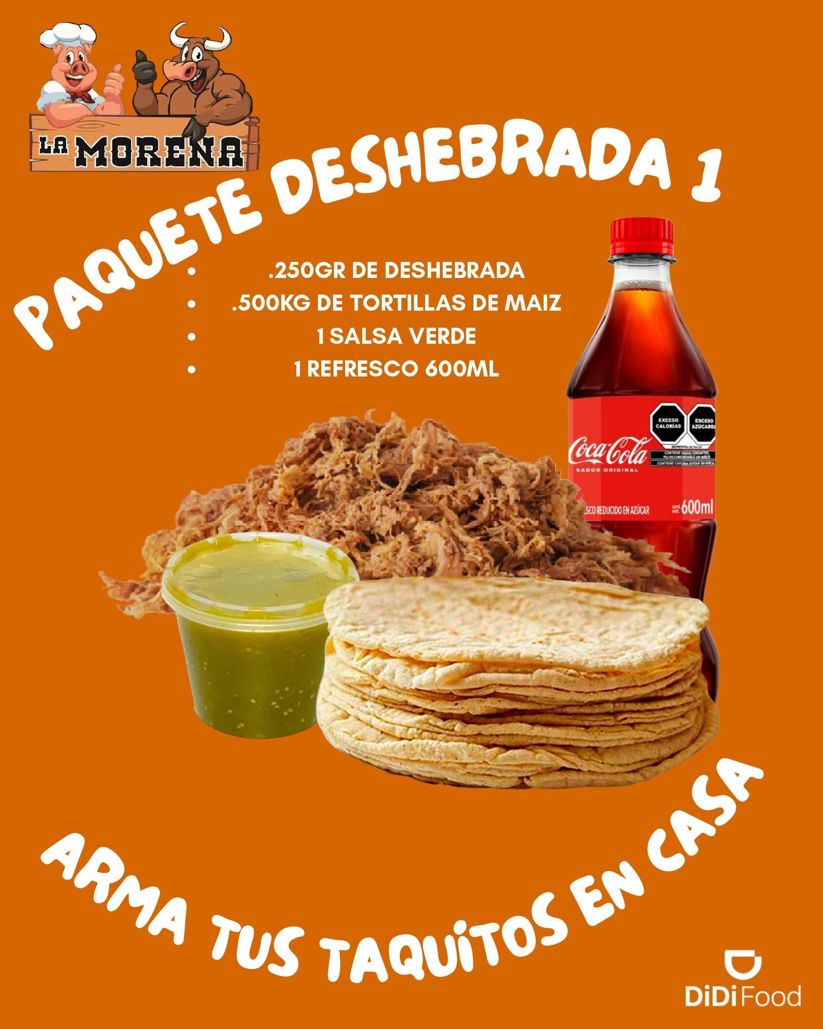 250 gr de Deshebrada + Medio Kilo de Tortillas de Maíz + Salsa Verde + Refresco de 600 ML