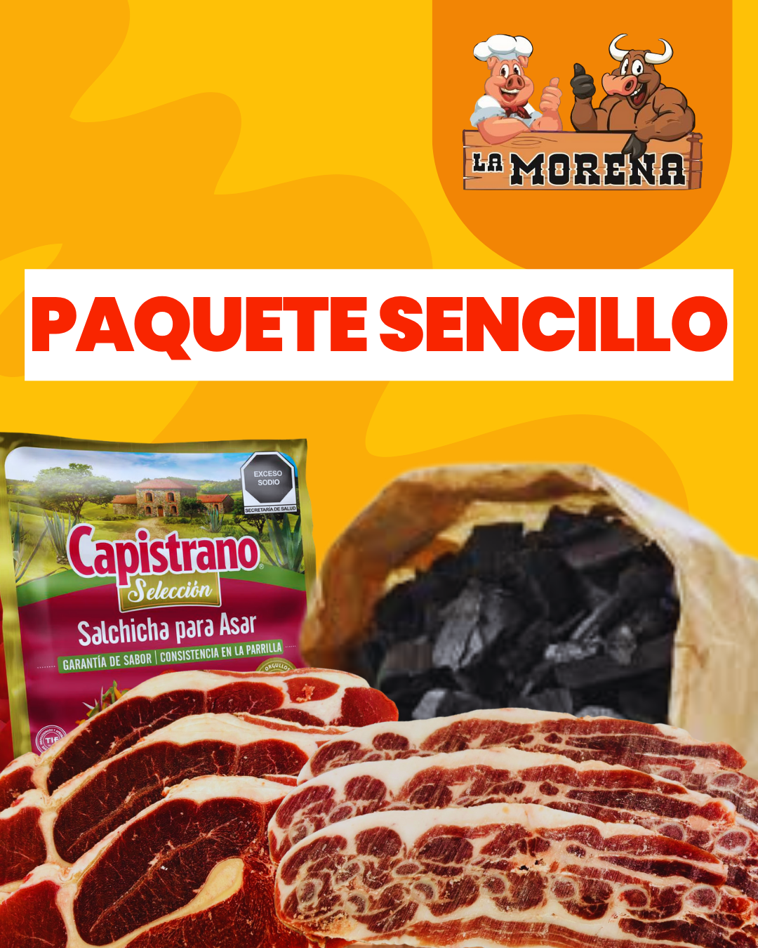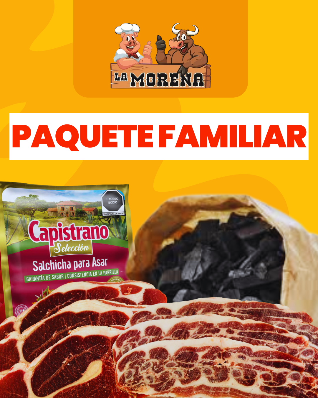 ¡Para las familias más grandes! incluye 3 kilos de chuleta de res, 1 kilo de costilla, 1 paquete de salchicha para asar, 1 paquete de carbón.