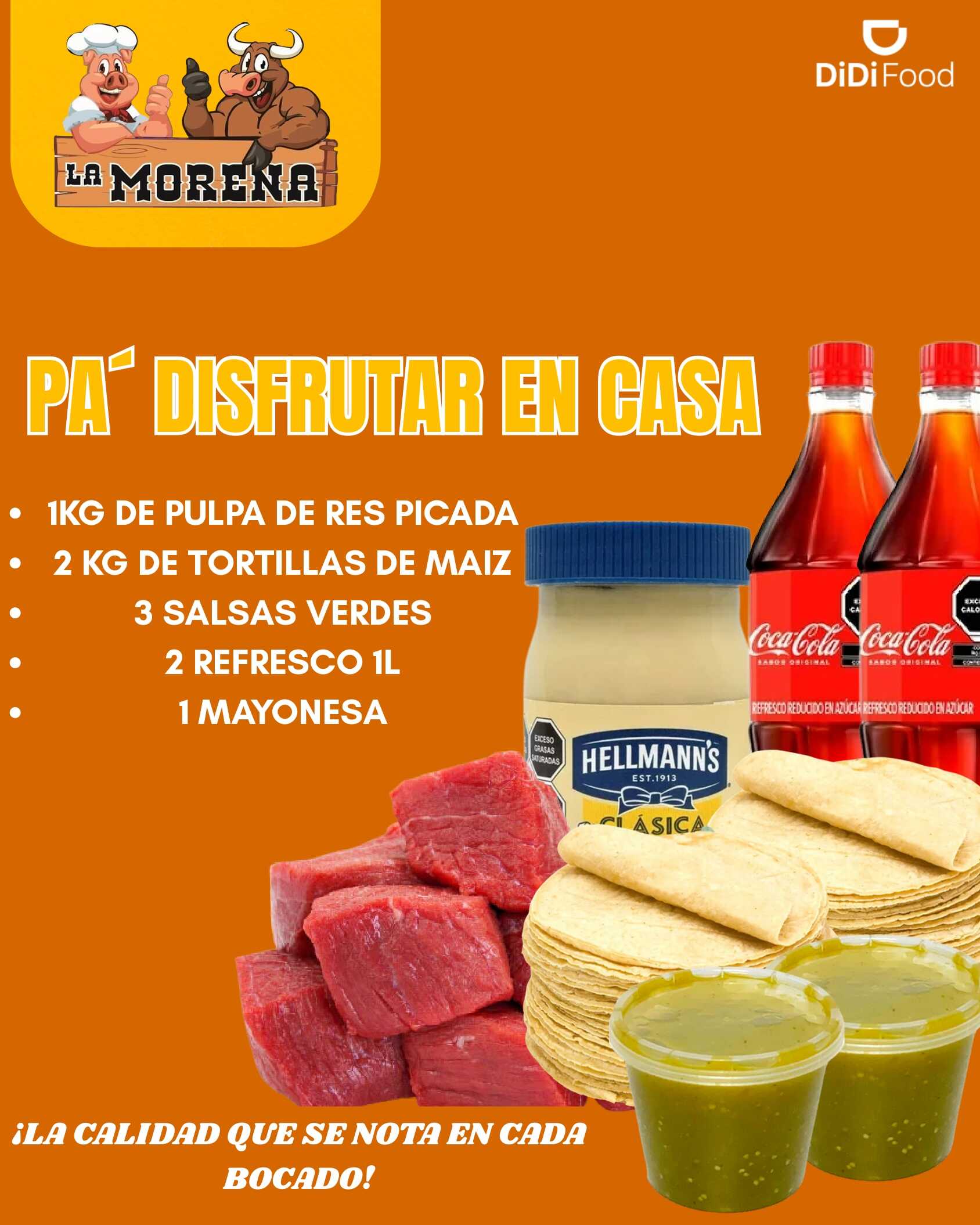 1 Kilo de Pulpa de Res Picada (Cruda) + 2 Kilos de Tortillas de Maíz + 3 Salsas Verdes + 2 Refrescos de Litro + 1 Mayonesa