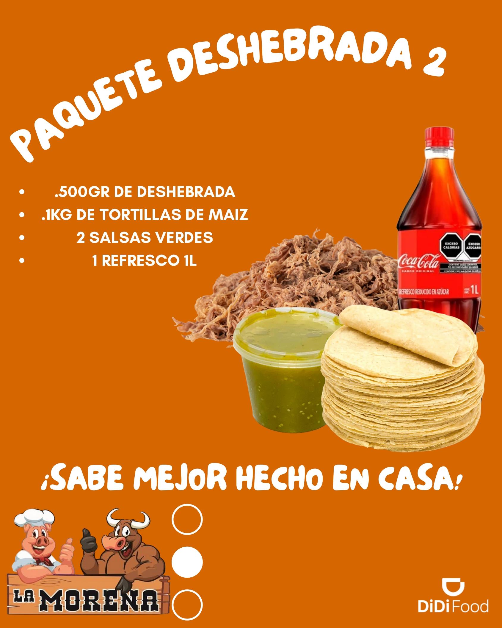 500 gr de Deshebrada + 1 Kilo de Tortillas de Maíz + 2 Salsas Verde + Refresco de 1 Litro