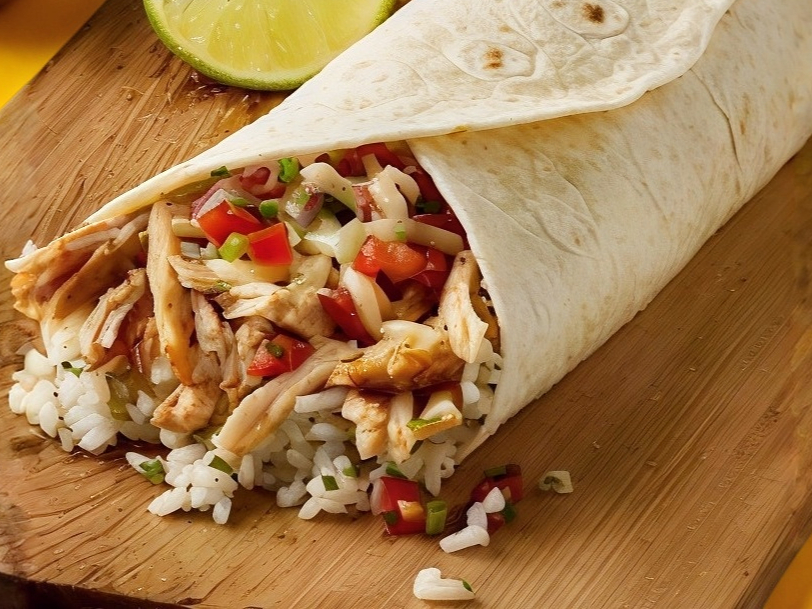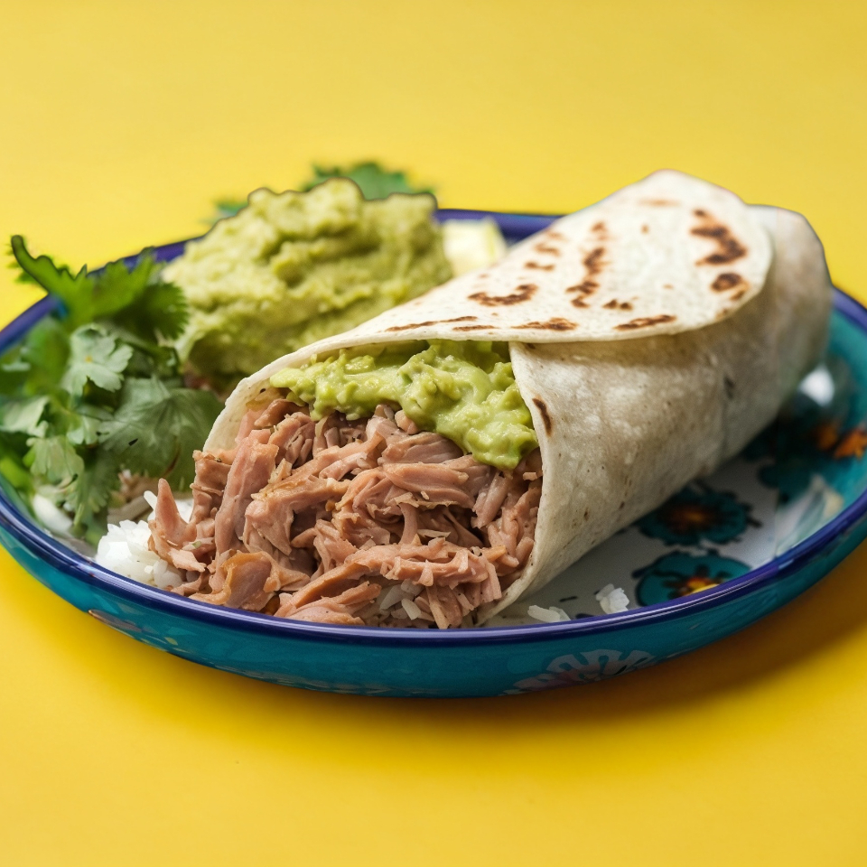 Rico Burrito De Carnitas Con Morcon Mayonesa Y Aguacate Con Su Salsita Y Verdura