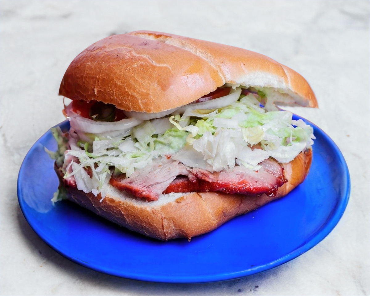 Torta con lechuga, tomate, cebolla, aguacate, chile y mayonesa.