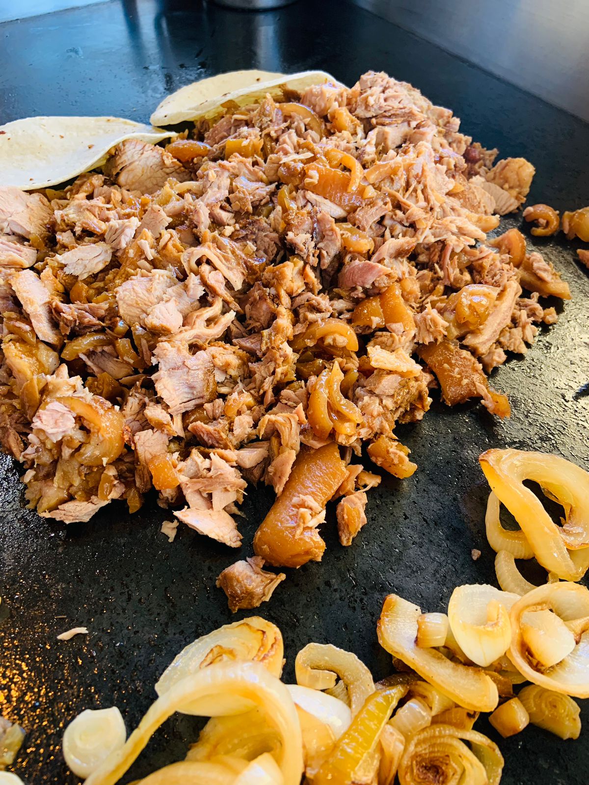Taco de chicharrón de cachete picadito, en tortilla de maíz. Incluye 1 salsa y cebolla morada