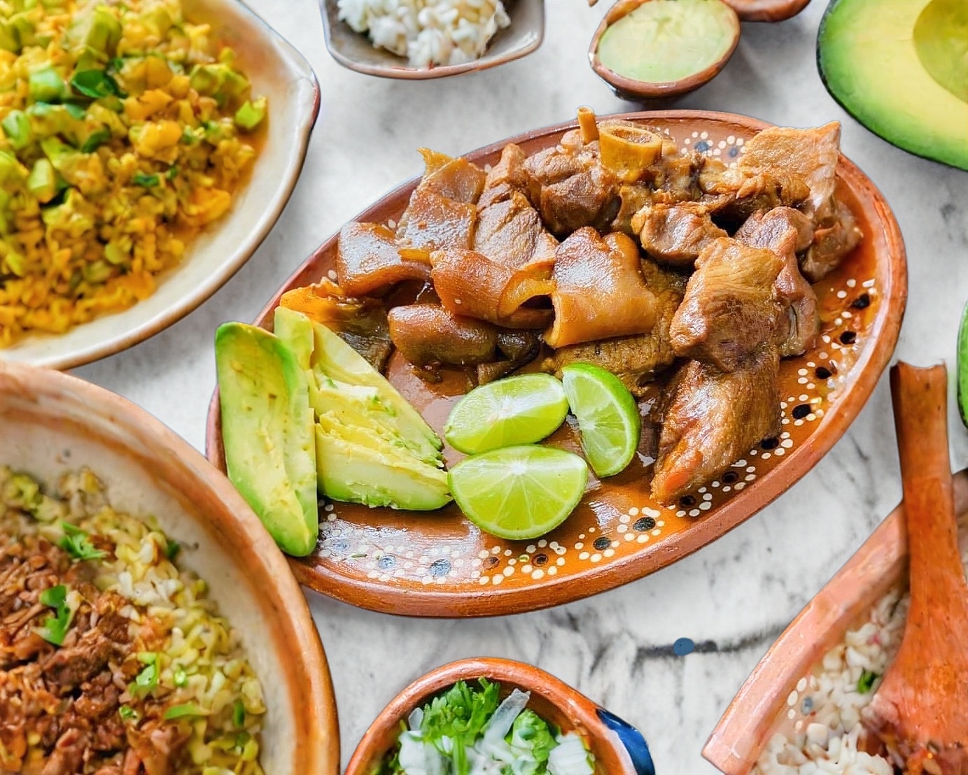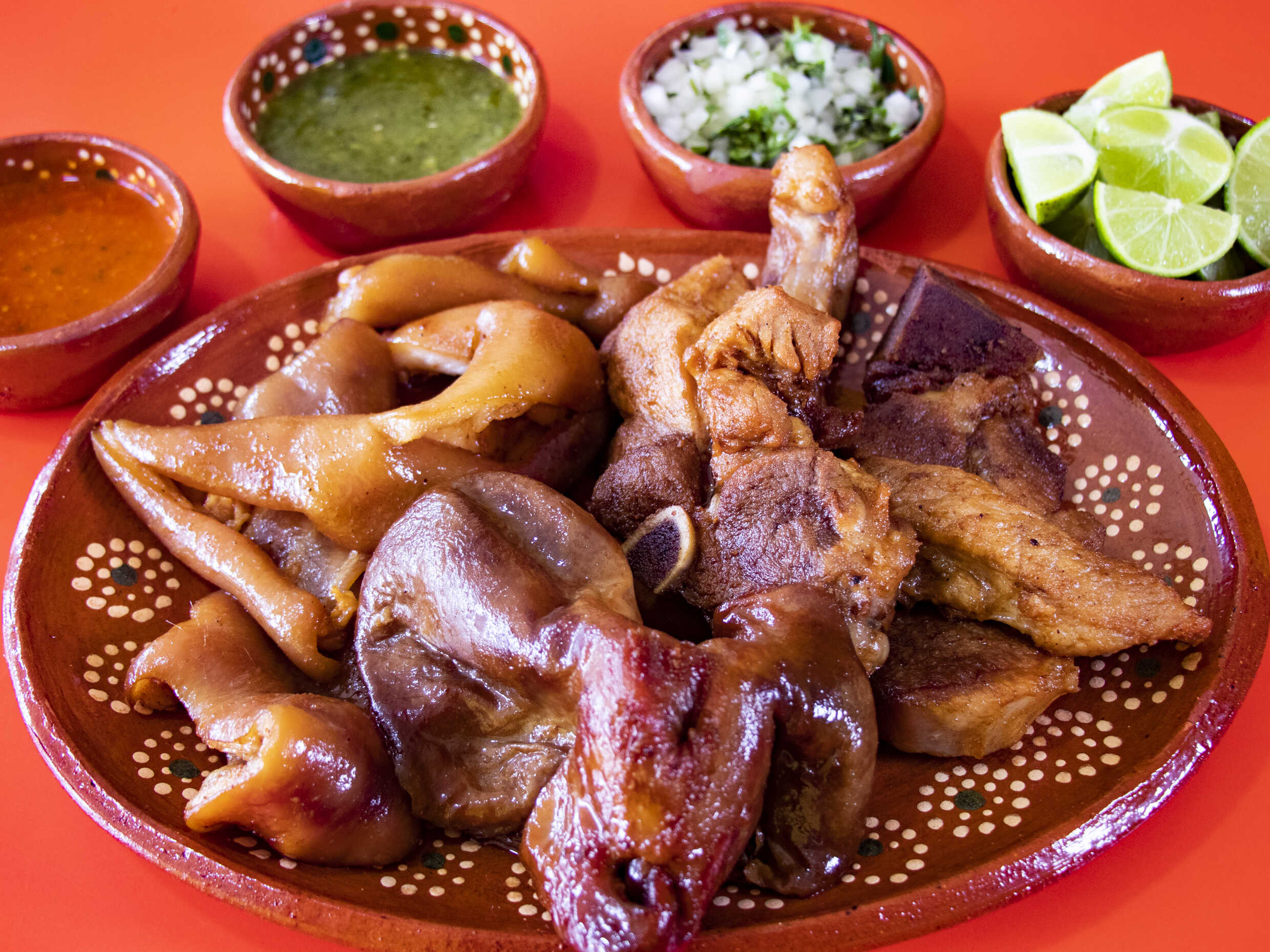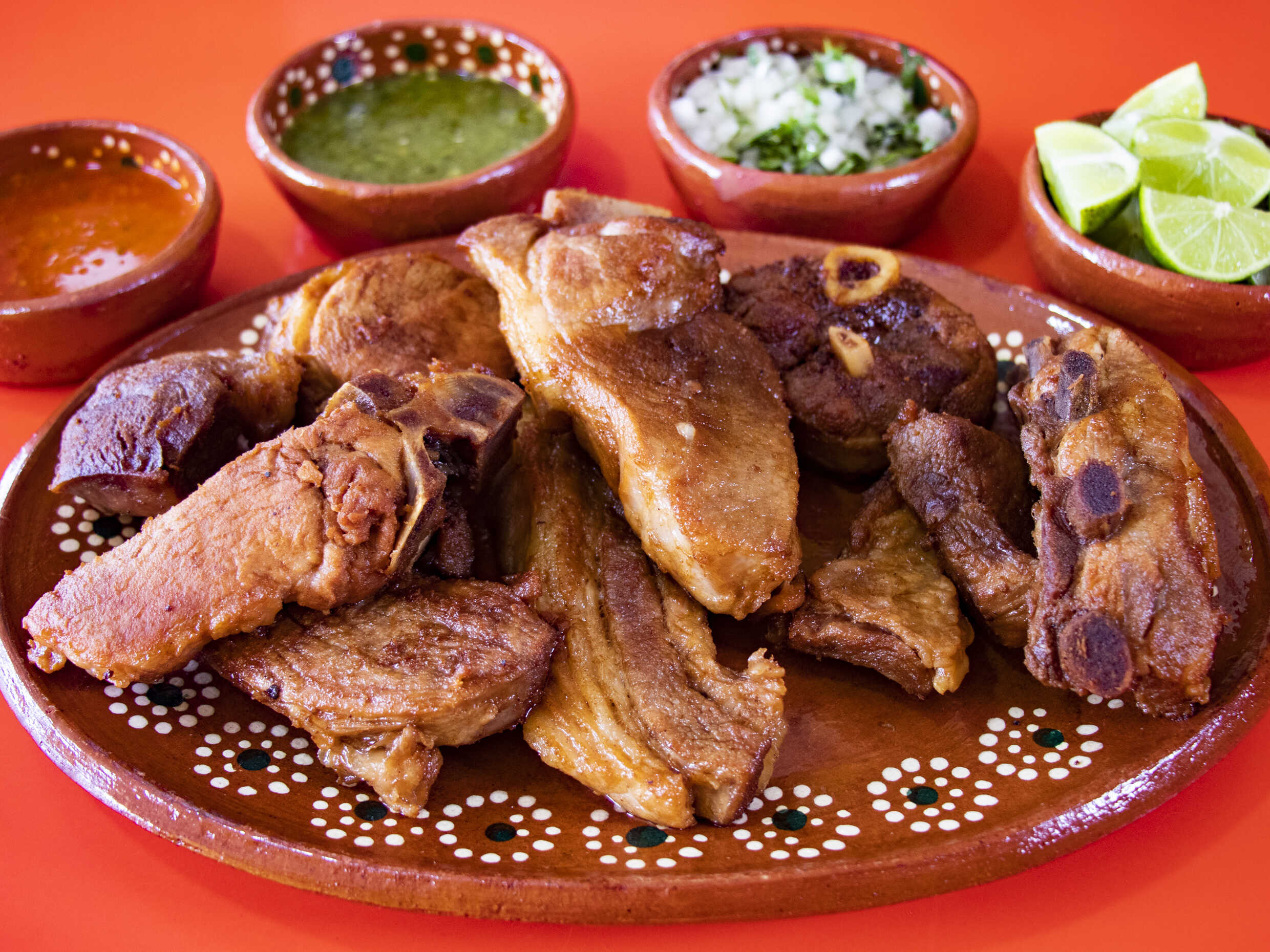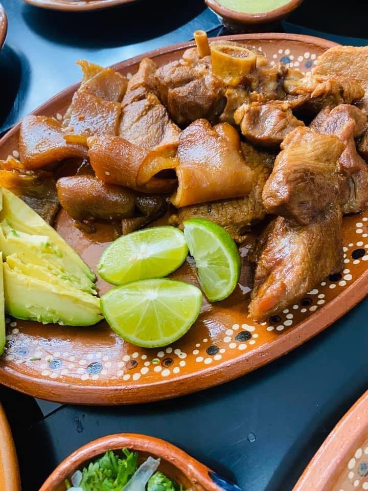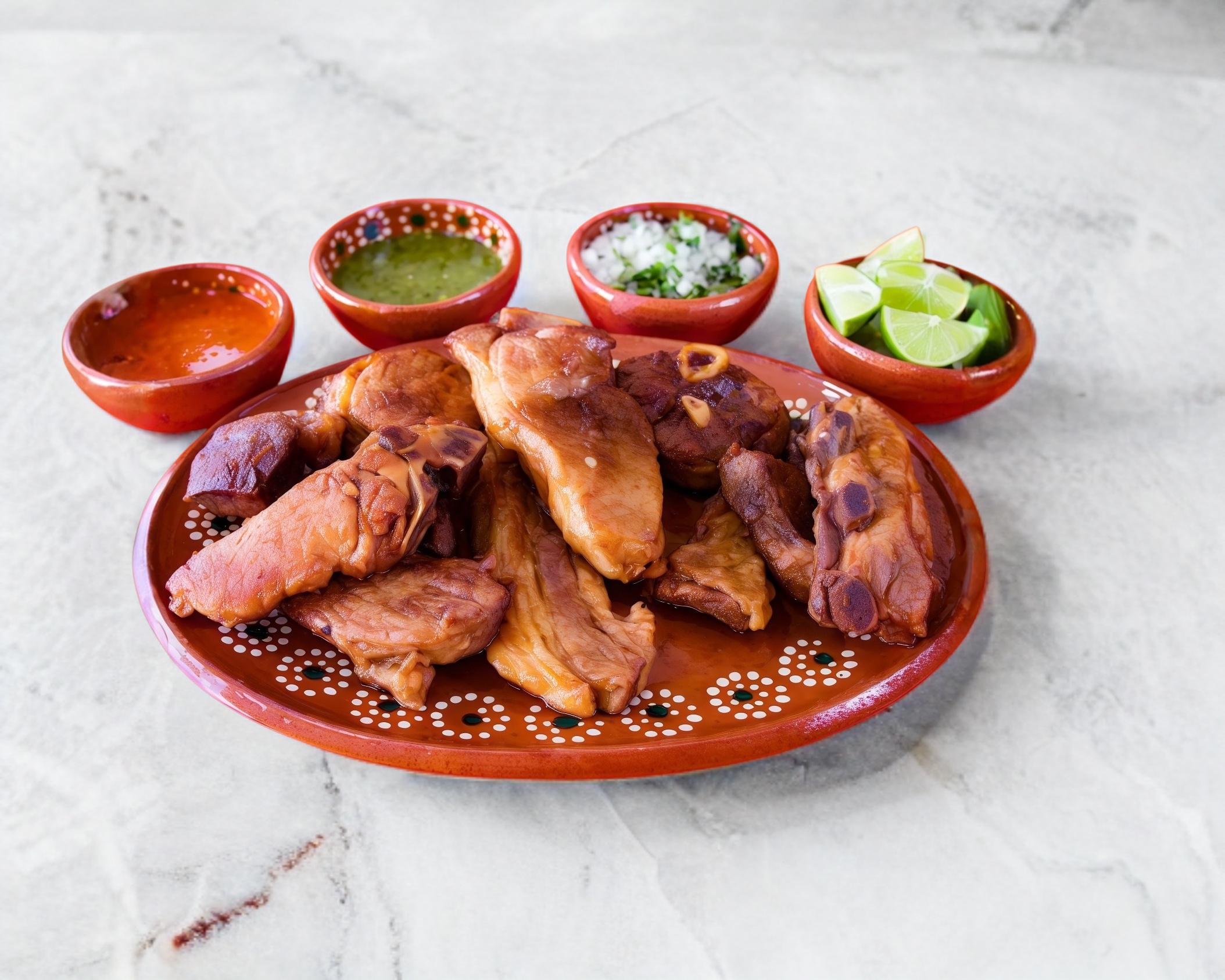 Combinado con carnitas y cueritos, tortillas, limones, cilantro y cebolla, salsa ver y roja.