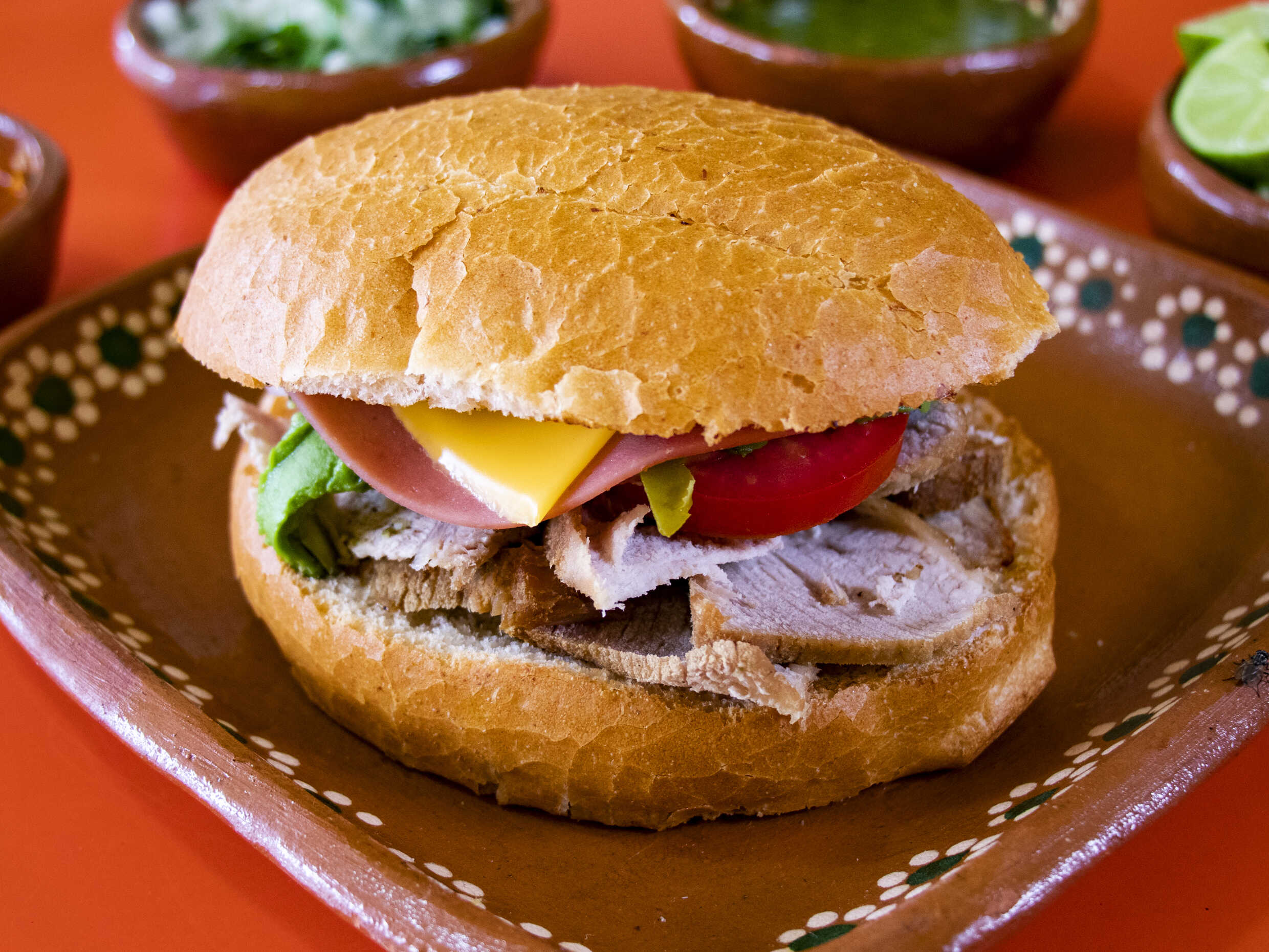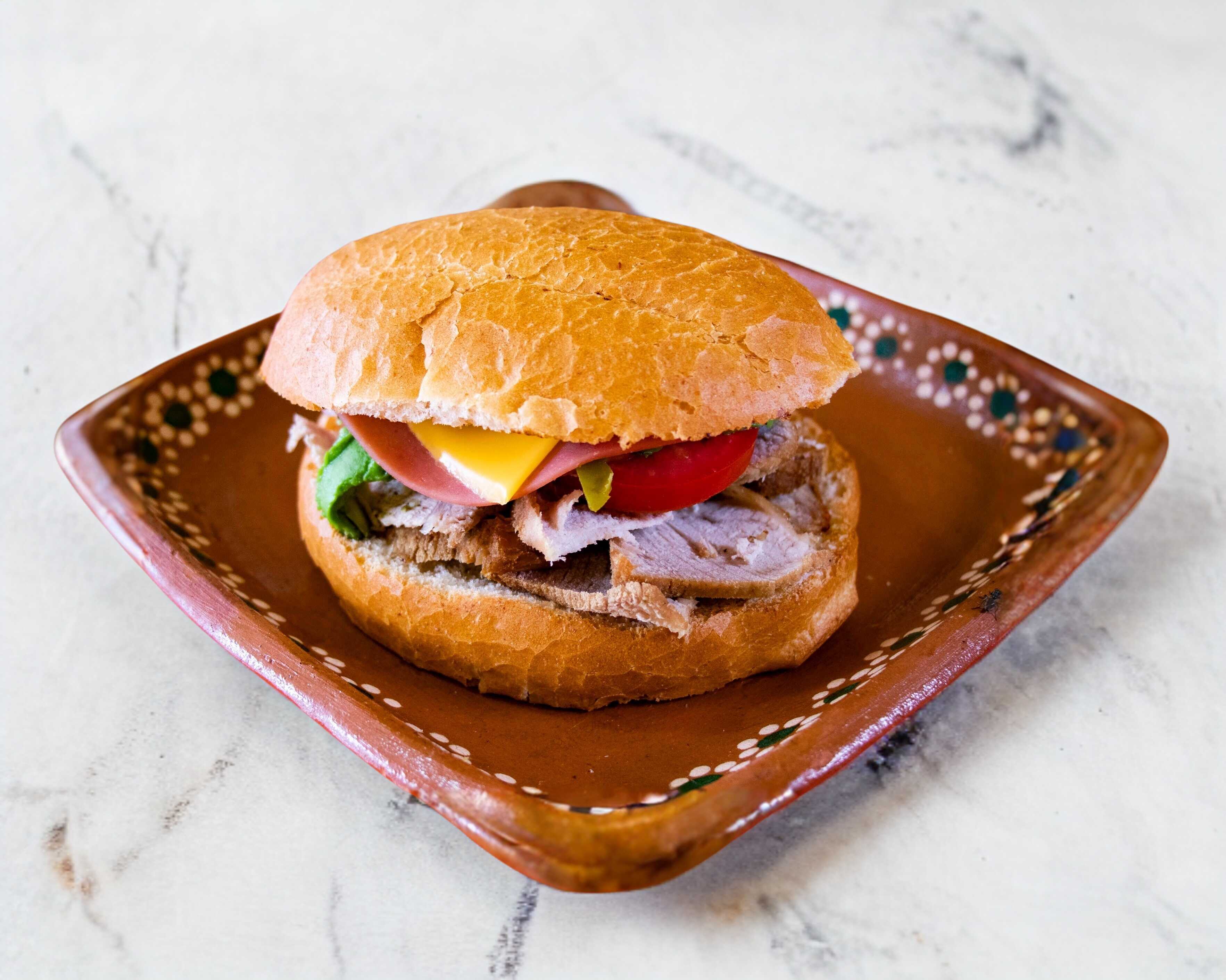 acompañada con mayonesa, mostaza, aguacate, chile jalapeño, tomate, cebolla, carnitas y cueritos.