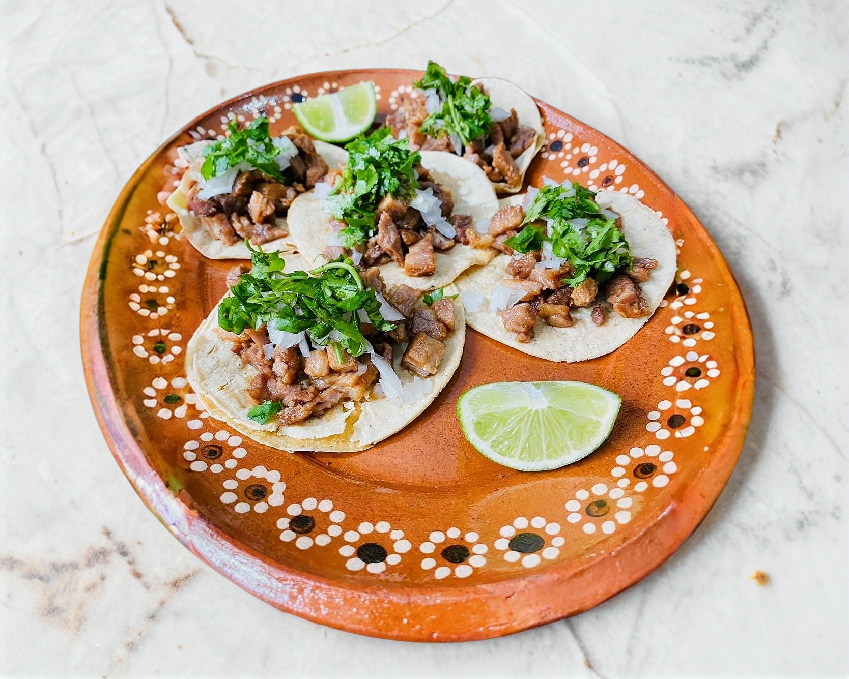 Incluye tortillas, salsa roja, salsa verde, limones, cebolla y cilantro.