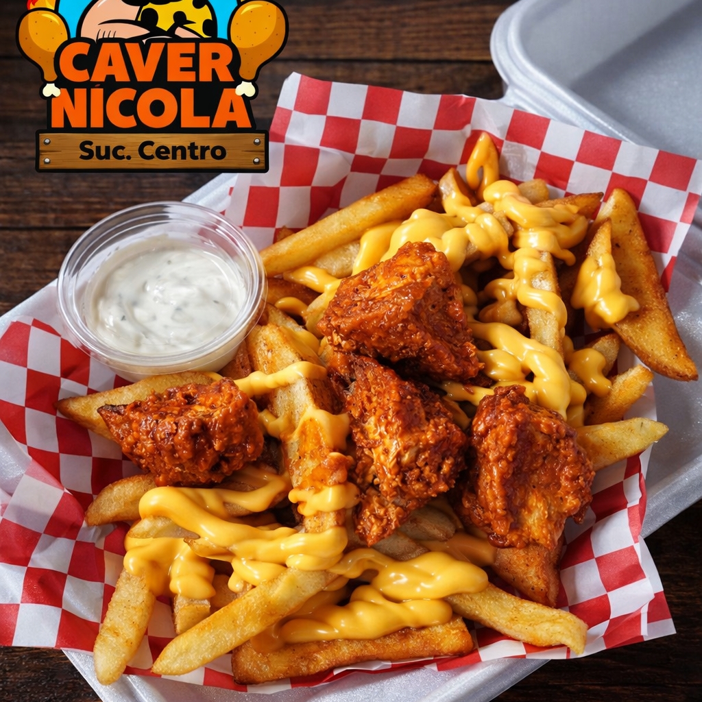 Exquisitos boneless crujientes (300gr) servidos con una porción de papas a la francesa bañadas de queso. Sabor gigante para un hambre feroz.