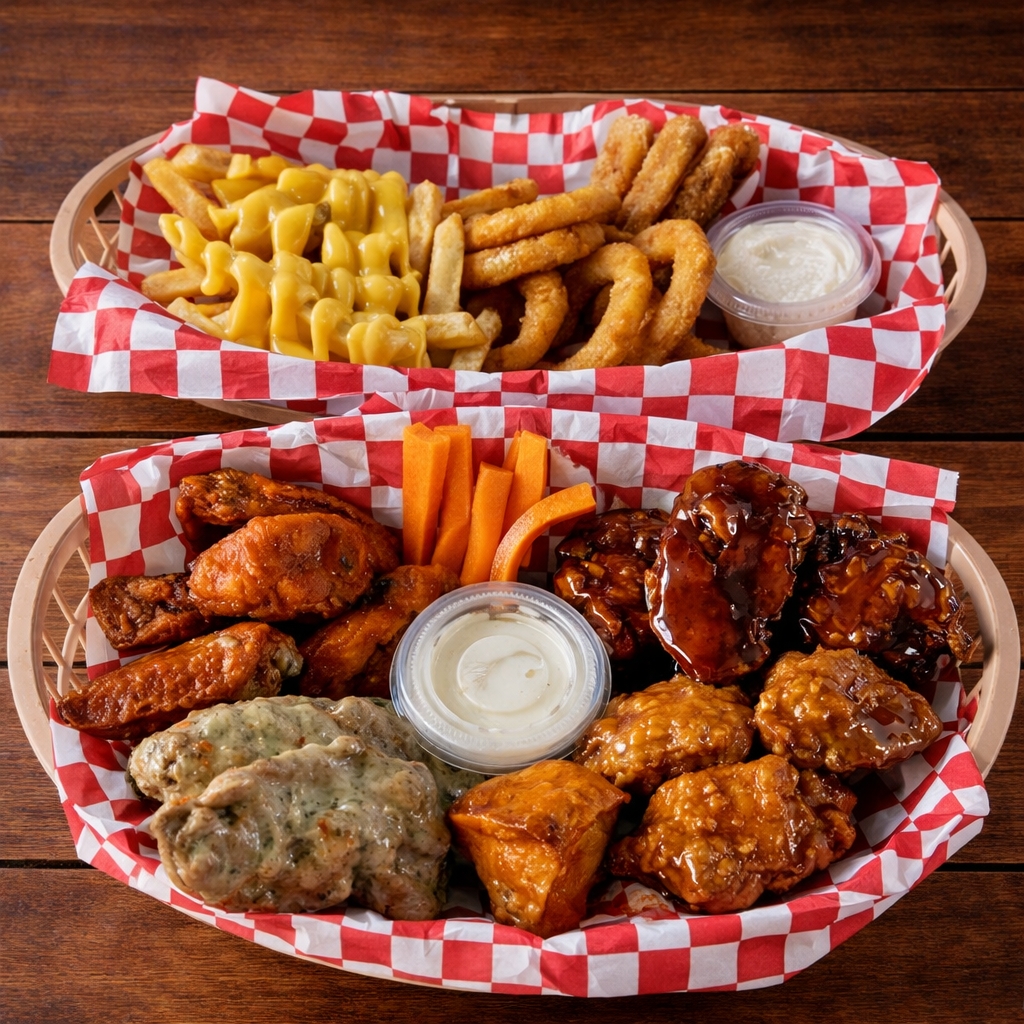 El mix perfecto: 300gr de boneless crujientes, 1/2 de alitas jugosas, papas a la francesa y papas en gajo. Variedad y sabor en un solo plato.