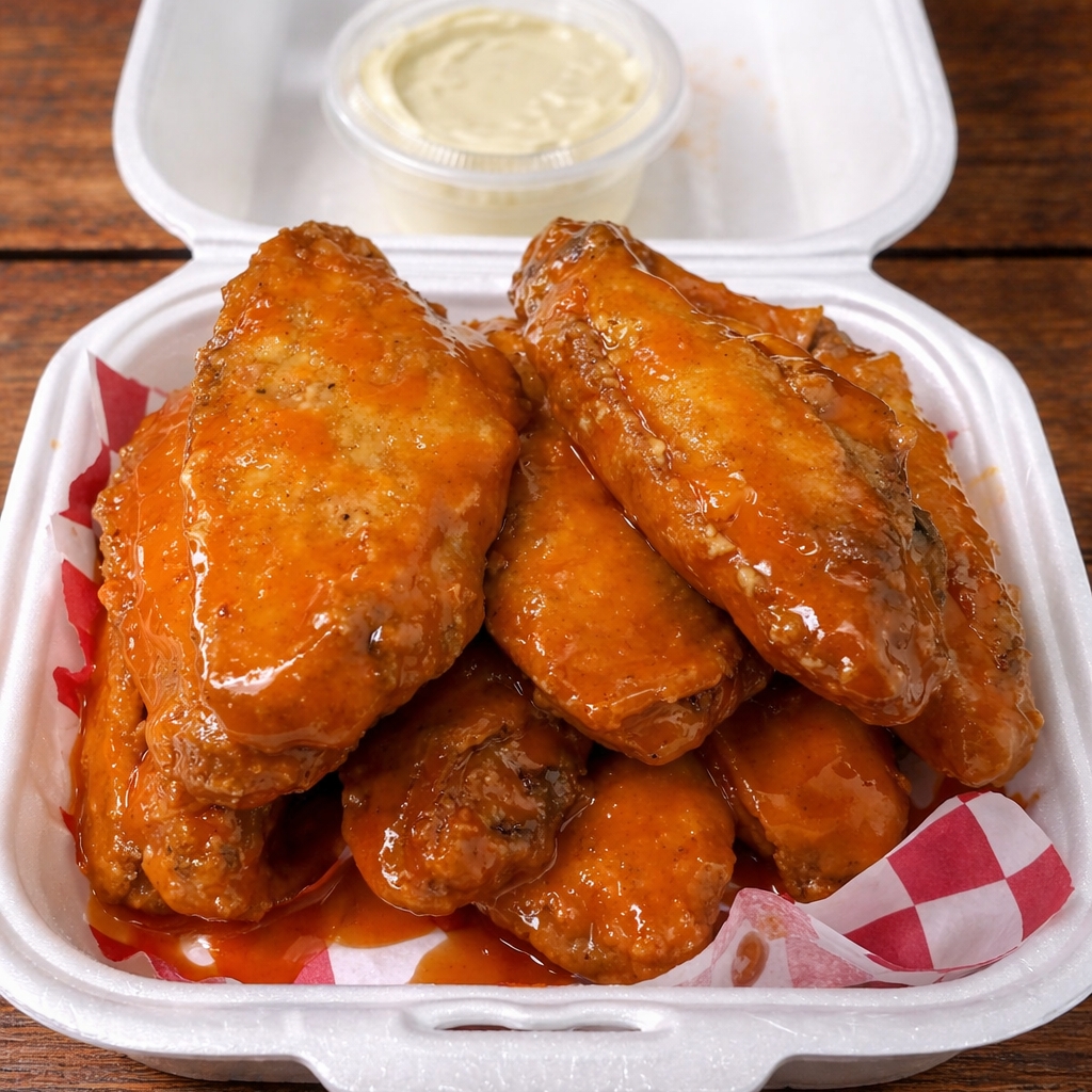 Media porción de alitas fritas a la perfección, crujientes y sabrosas. Ideales para un antojo personal o para complementar tu comida.