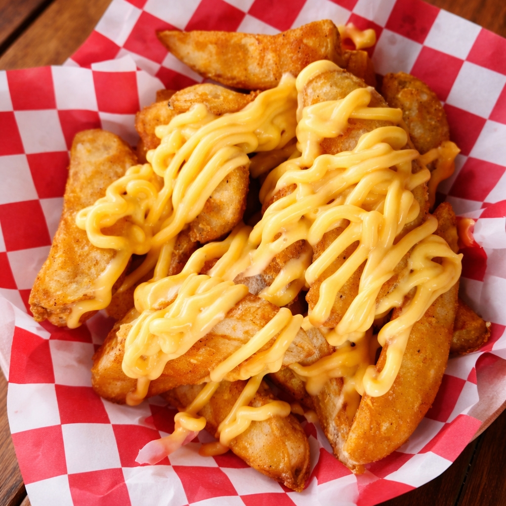 Papas rústicas cortadas en gajo, con una textura suave por dentro y crujiente por fuera, sazonadas para resaltar su sabor natural y bañadas en queso amarillo.