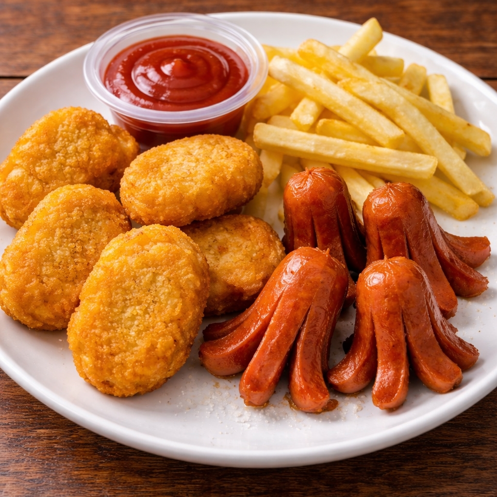 Combo infantil pensado para los pequeños: incluye orden de papas, salchipulpos y nuggets de pollo. Diversión y sabor en cada bocado.