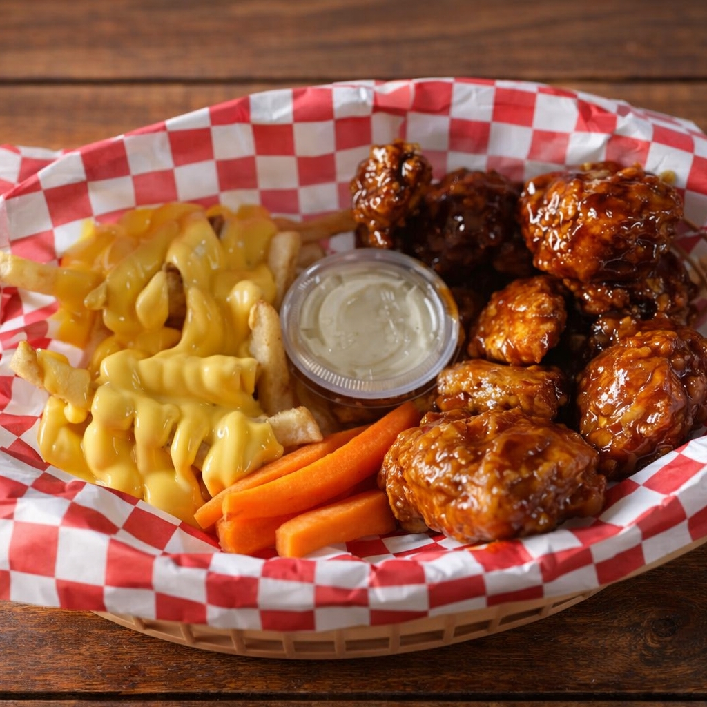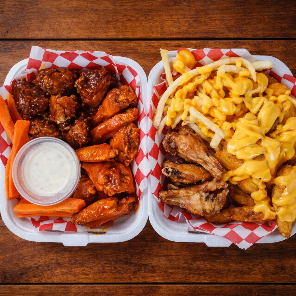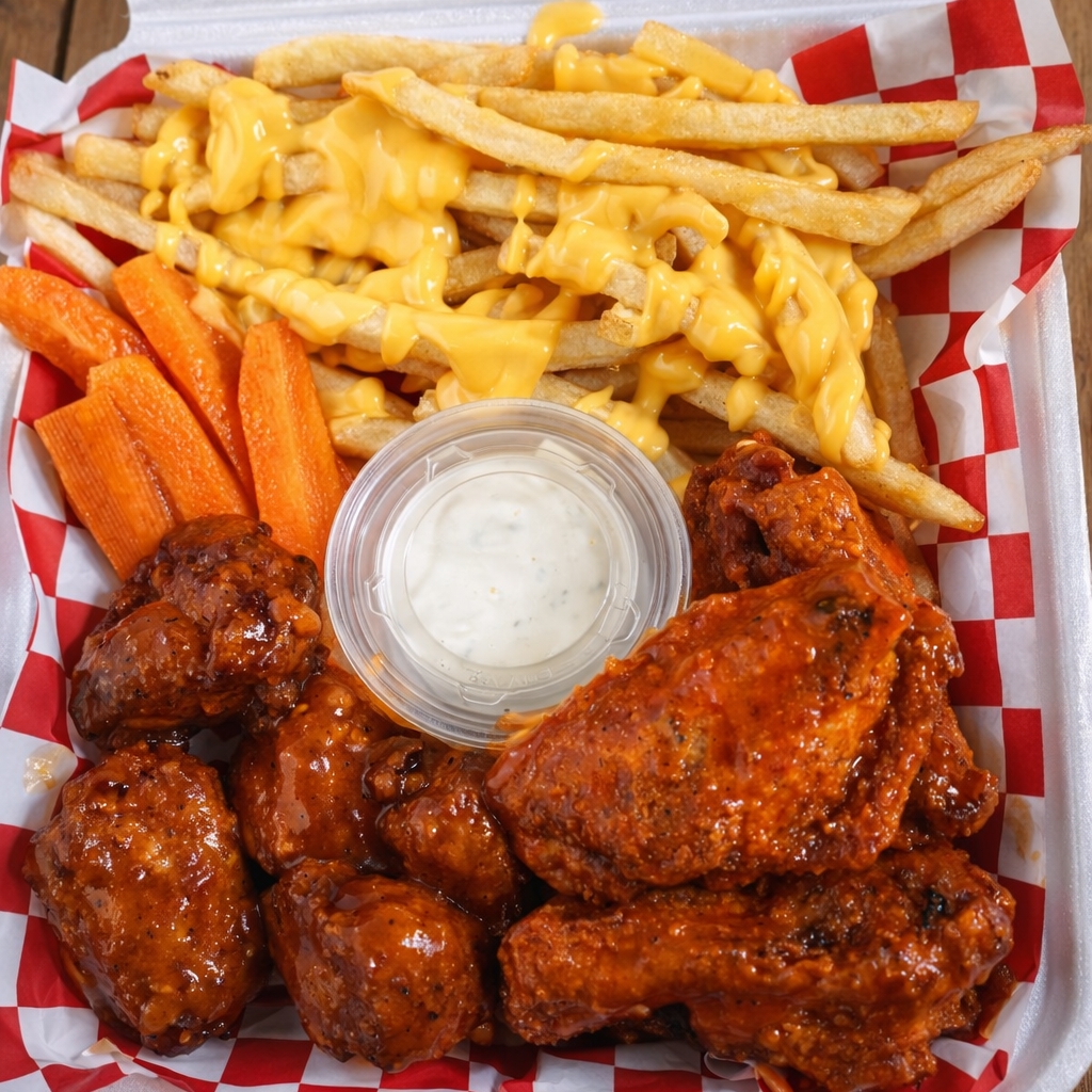 Gran combinación de boneless crujientes y alitas, acompañados de papas a la francesa bañadas de queso. Todo lo que te gusta en un solo combo.