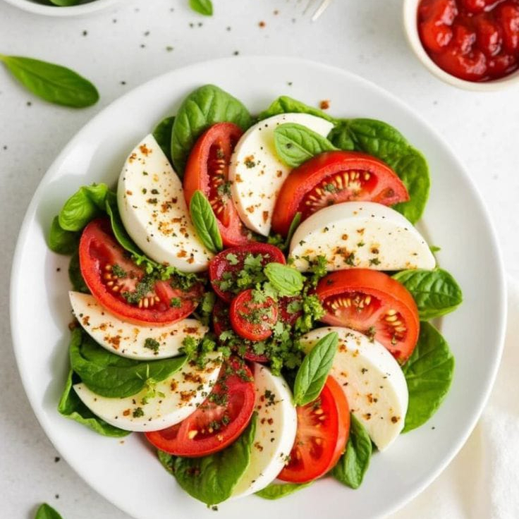 Queso panela, tomate fresco, albahaca seca, espinaca y vinagreta