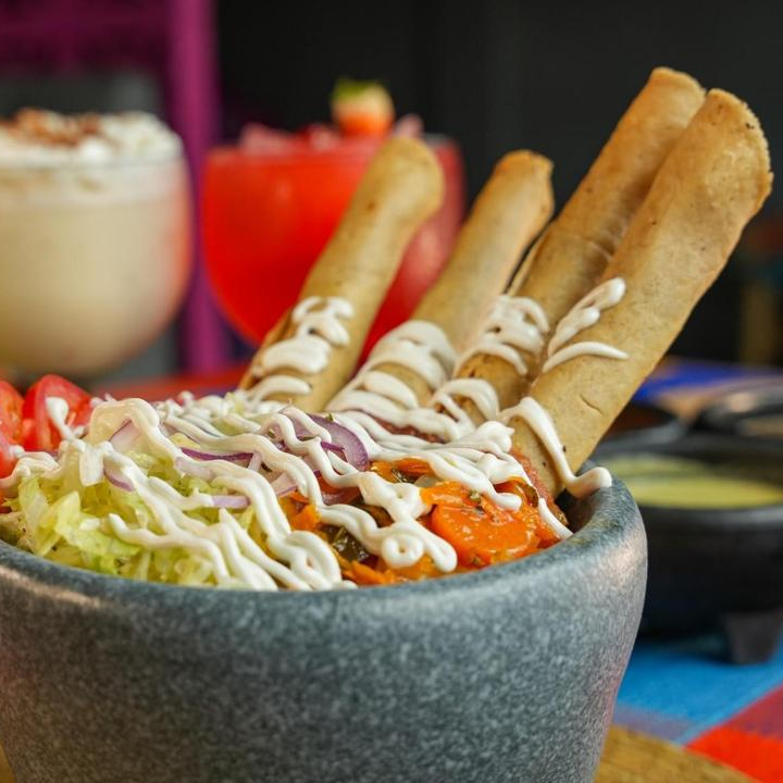 Paquete de 15 flautas de 21 cm surtidas de carne, papa, frijol acompañadas de lechugo/repollo con salsa de tomate, escabeche michoacano, crema y salsa picosita de la casa