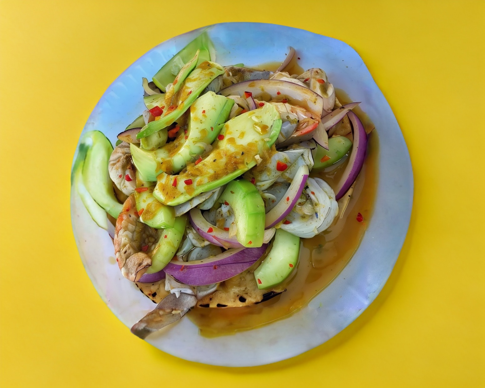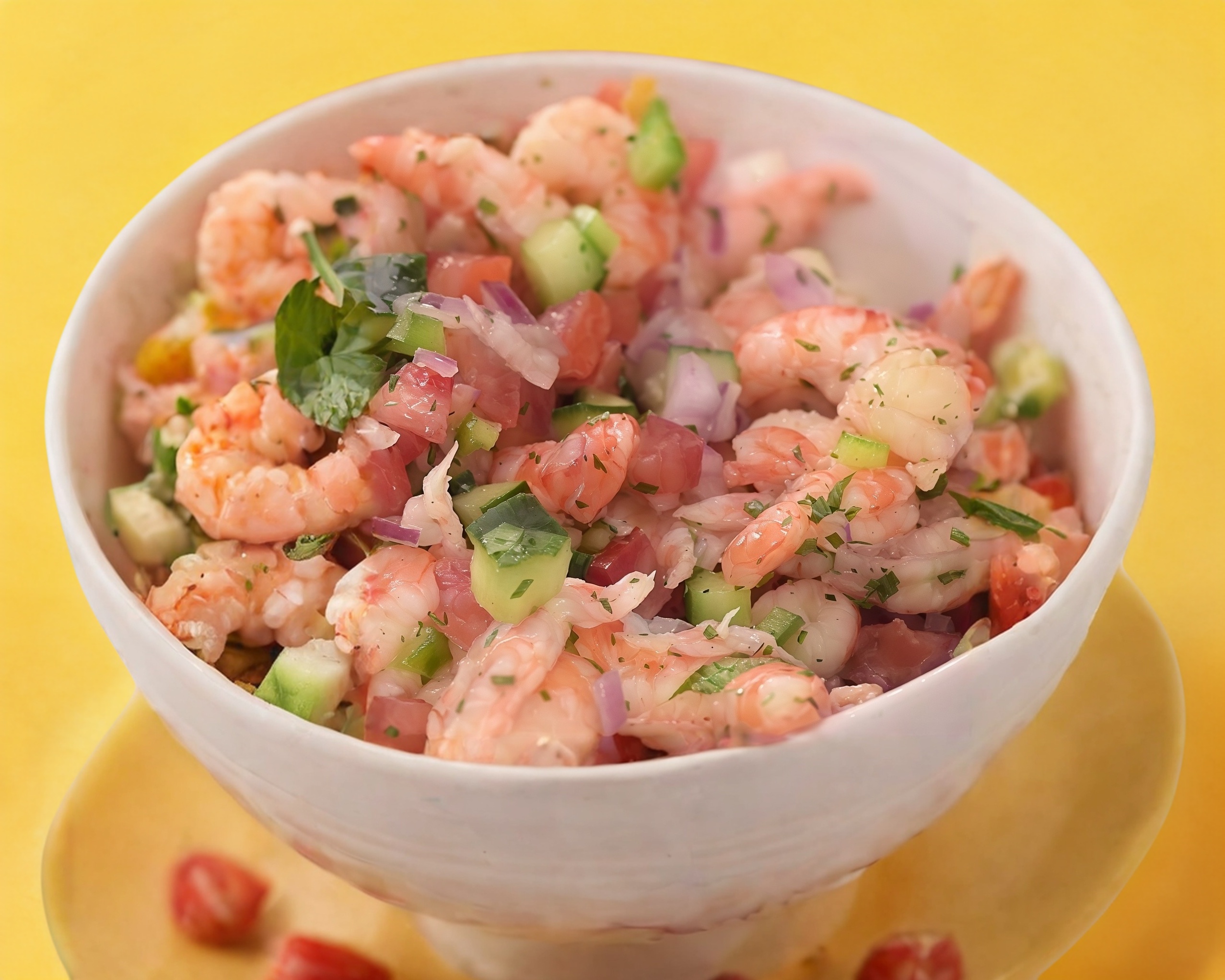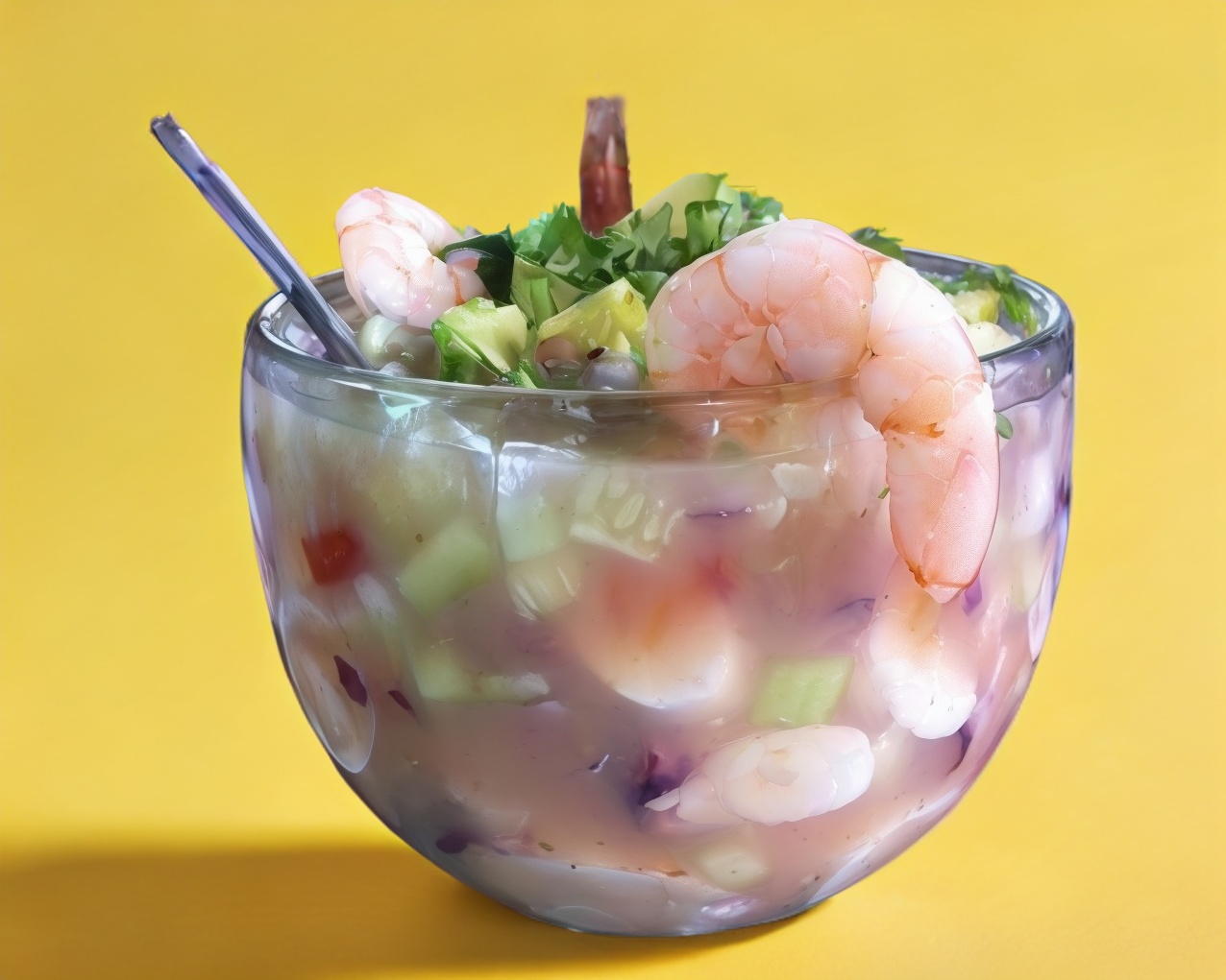 camarones en su jugo con calamar en trocitos, acompañados de tomate,cebolla morada,pepino y aguacate