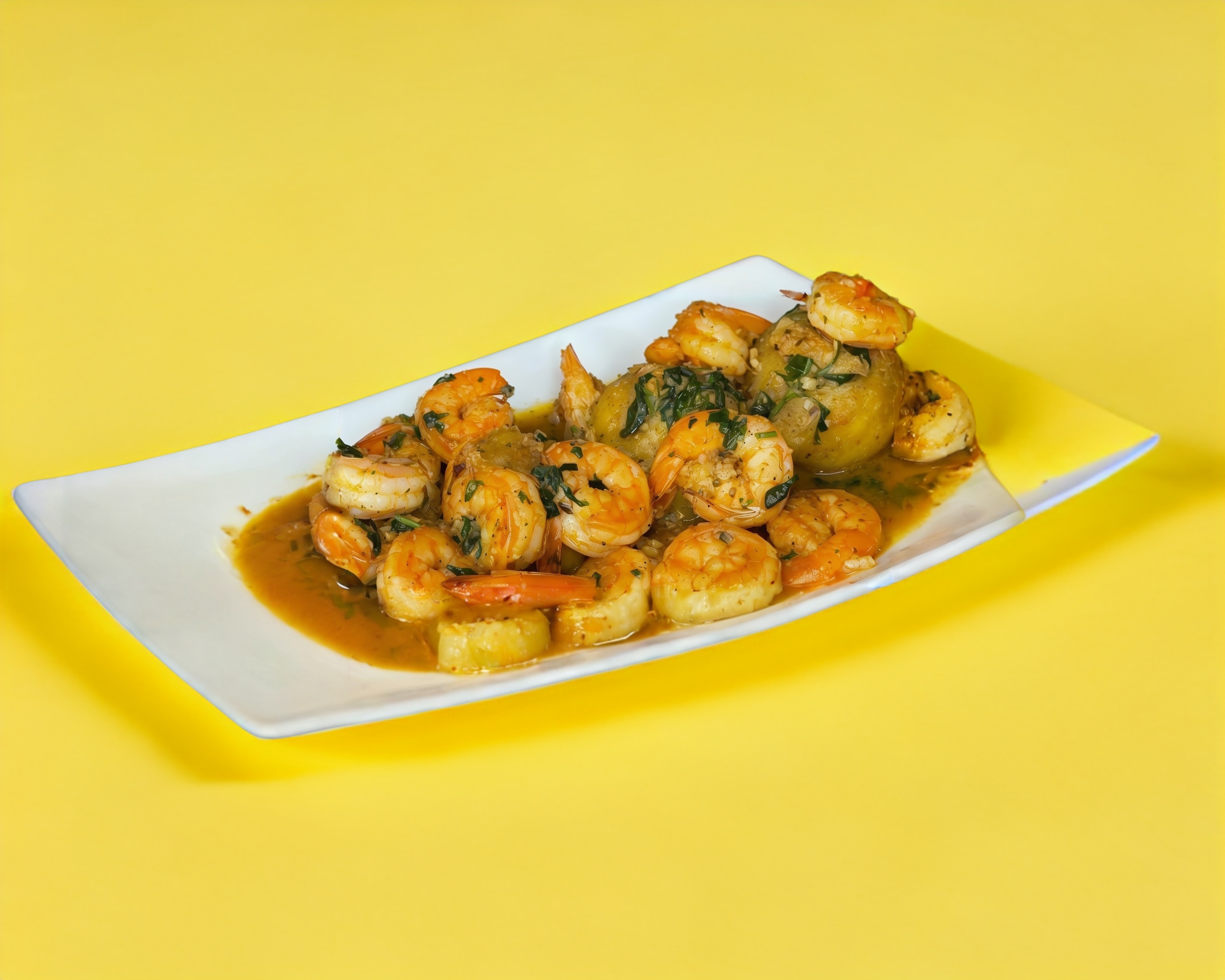 Camarones guisados con sofrito de ajo machacado con aceite de oliva ,especias y chile quebrado, acompañado de papas fritas y ensalada de lechuga