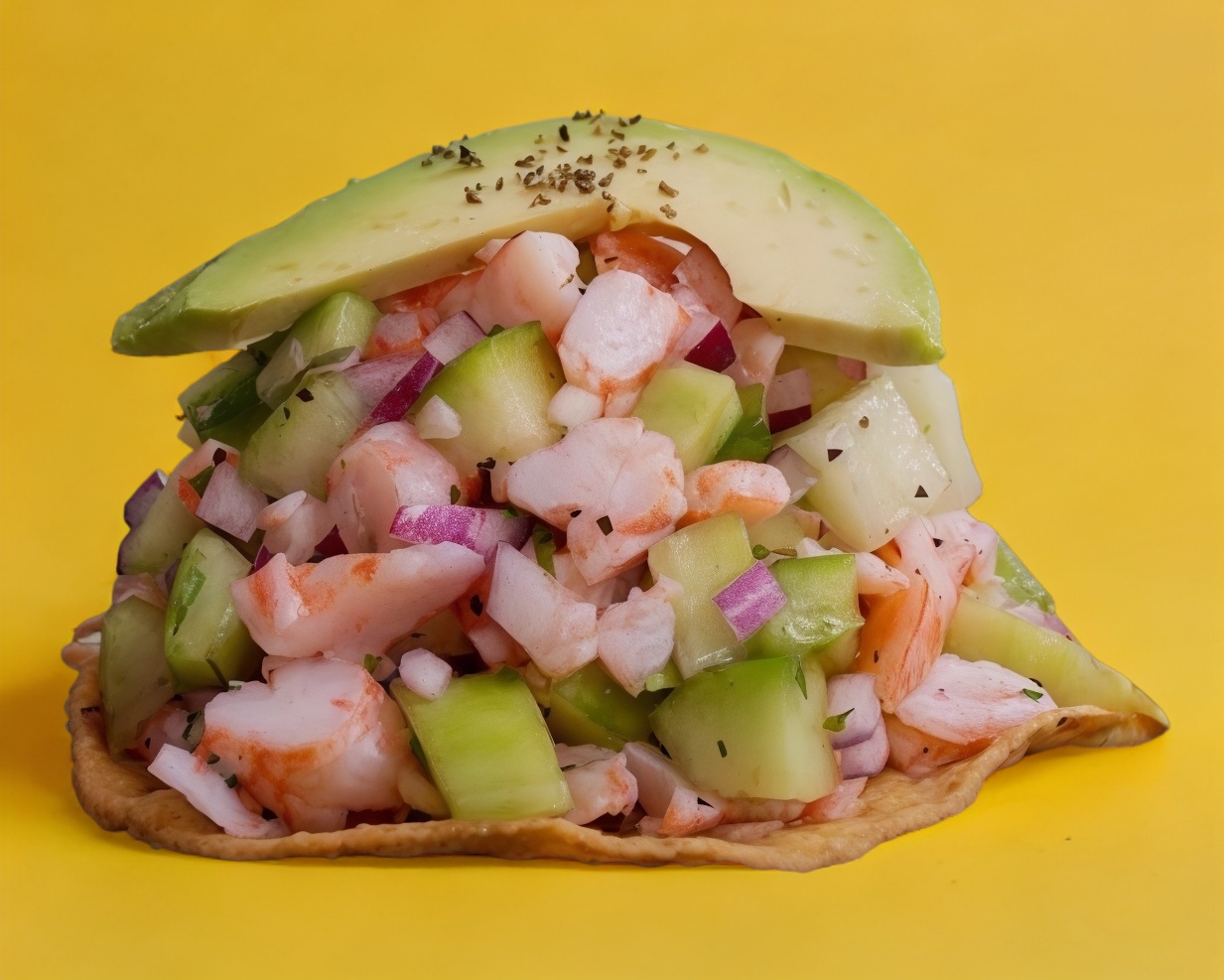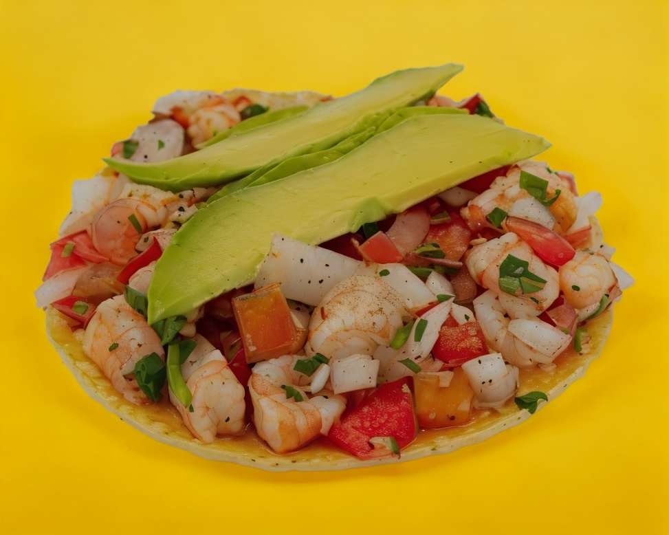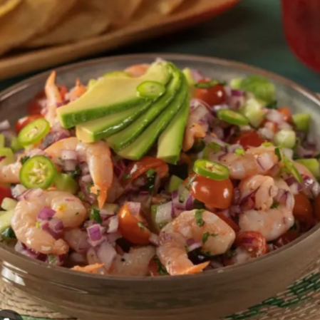 Camaron y pescado curtidos en limon acompañado de tomate,cebolla ,pepino y aguacate