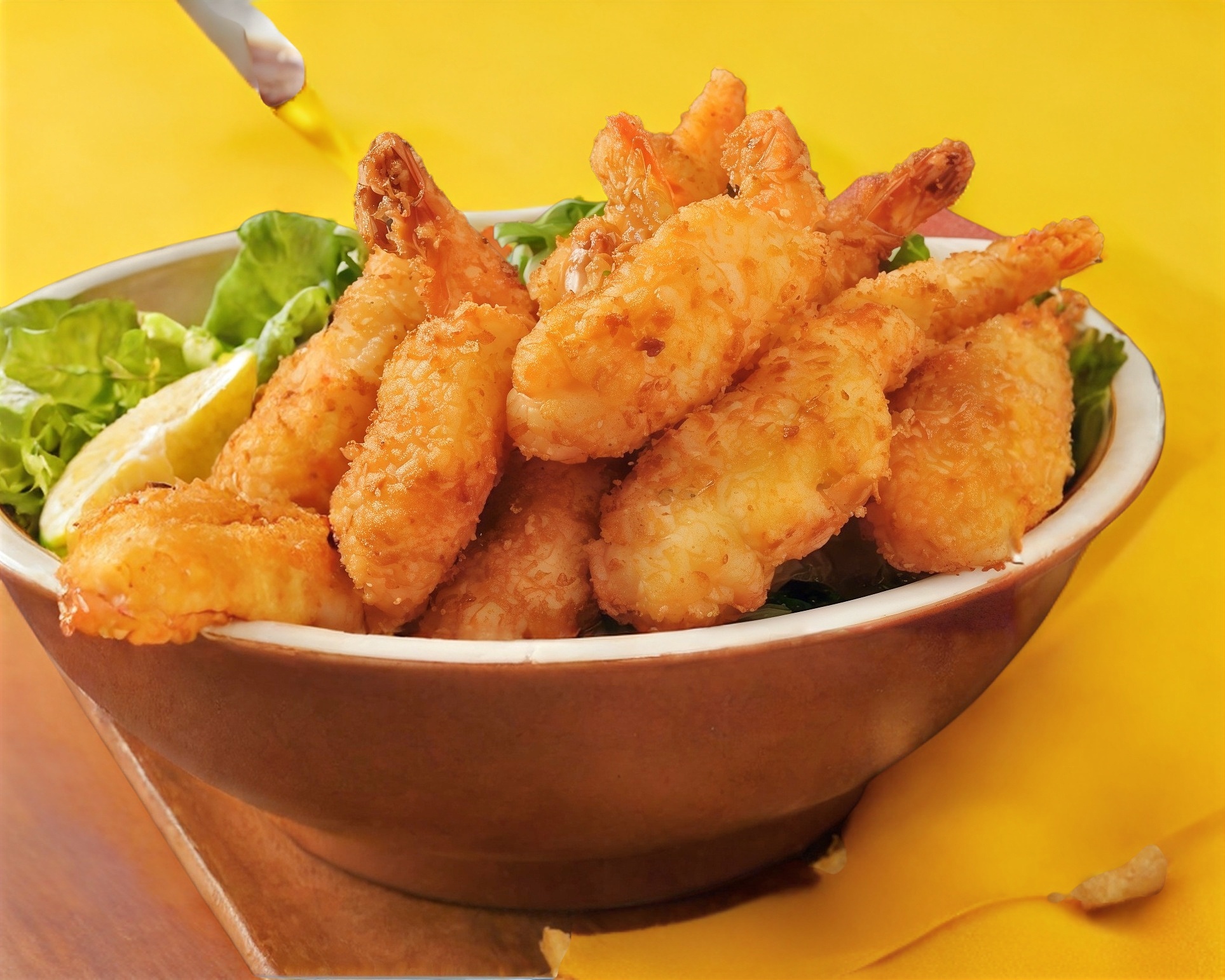 Camarones capeados acompañados de ensalada de lechuga y salsa casera