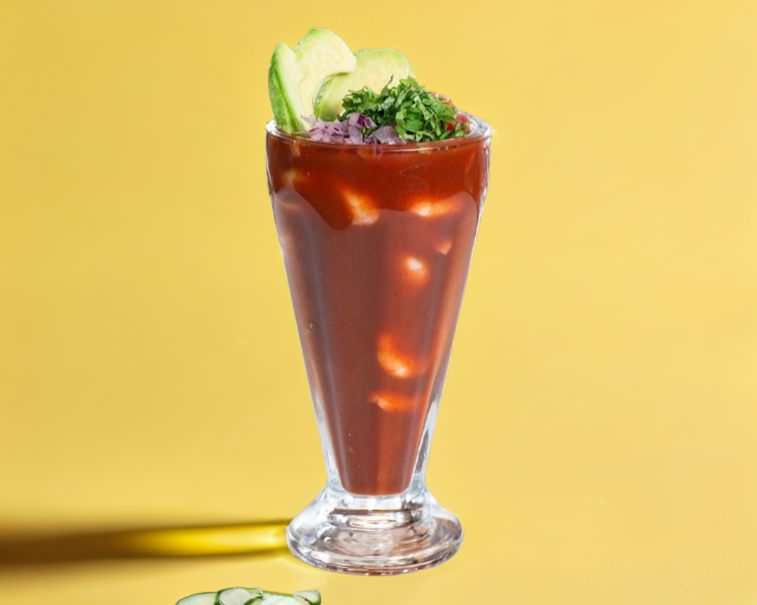 Trocitos de camarón crudo ,trocitos de camarón cocido ,cebolla morada,tomate,pepino,aguacate bañados en salsa negra con un toque de clamato