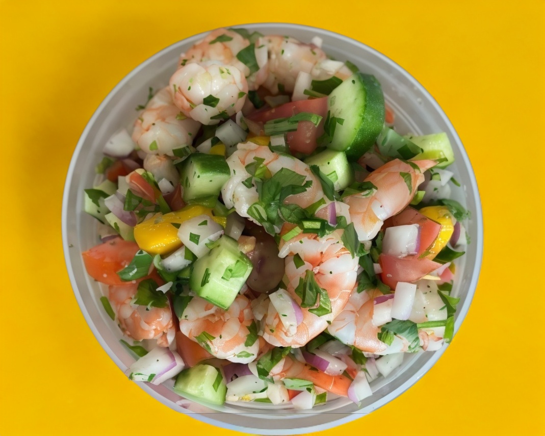 Camarones cocidos en su jugo ,acompañado de tomate, cebolla, pepino y aguacate