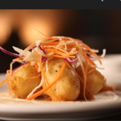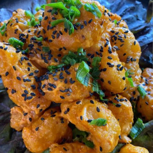 Camarones capeados en tempura de la casa ,bañados en aderezo chipotle ,acompañado de lecjufa zanahoria y aguacate