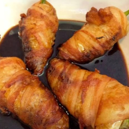 Orden de 4 Chiles caribe relleno de camarones con queso envueltos en tocino, acompañado de una cama de lechuga,zanahoria rallada y salsas negras
