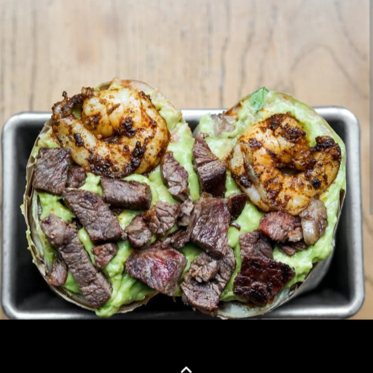 Tortilla de harina, guacamole,carne de res asada y camarones
