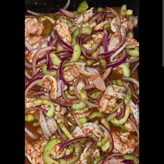 Camarón curtido en limon ,acompañado pepino,cebolla morada y agiacate ,bañado en salsa negra de la casa