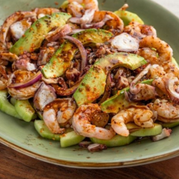 Camarones,calamar,ceviche de pescado y surimi acompañado de tomate,cebolla,aguacate ,pepino y limon