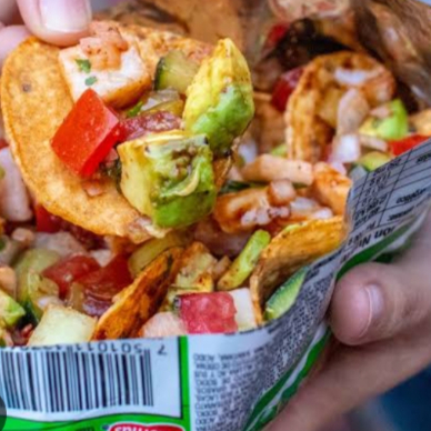 Tostitos ,camarones,pepino,tomate,cebolla ,limon,salsas negras y aguacate