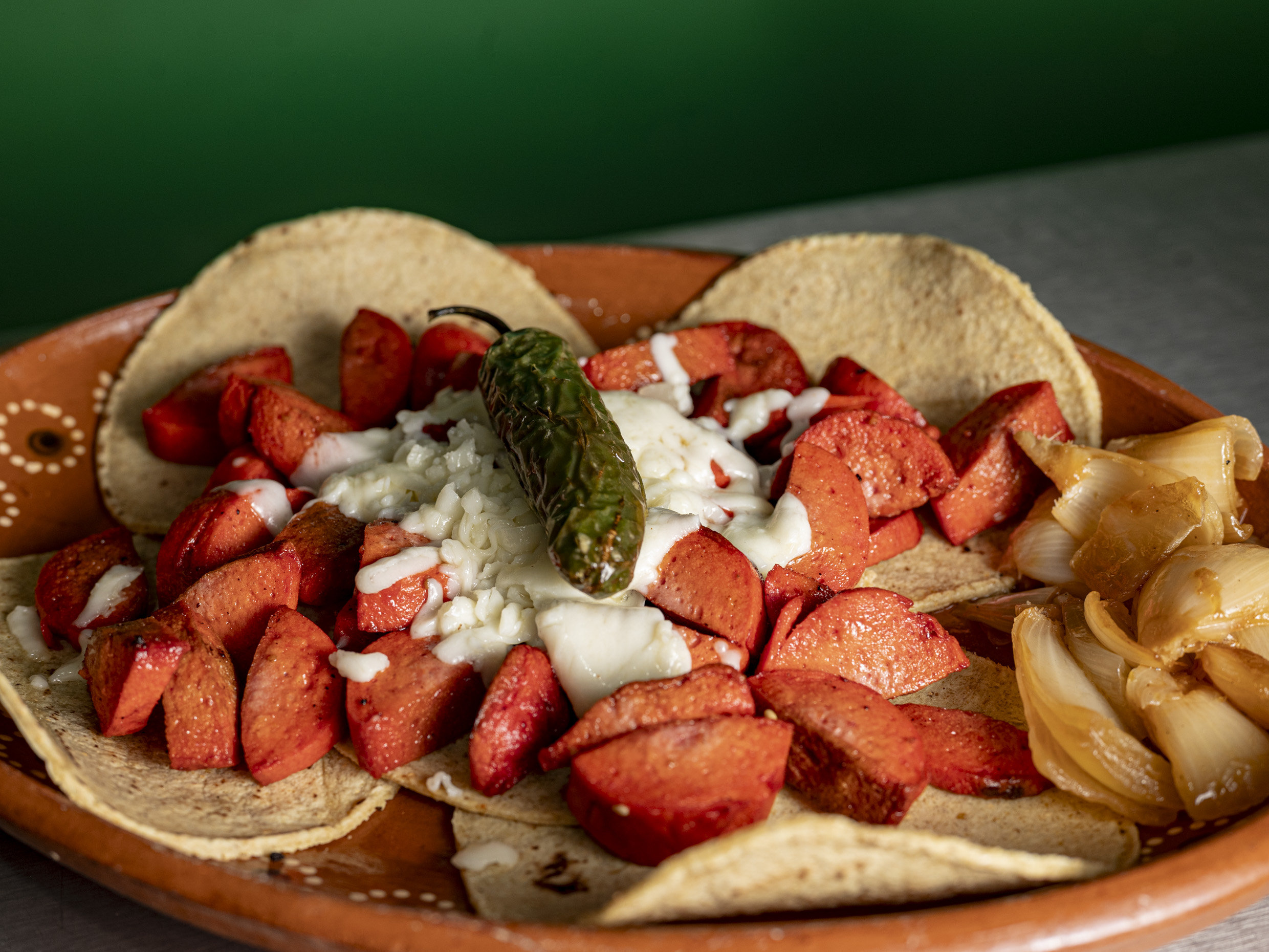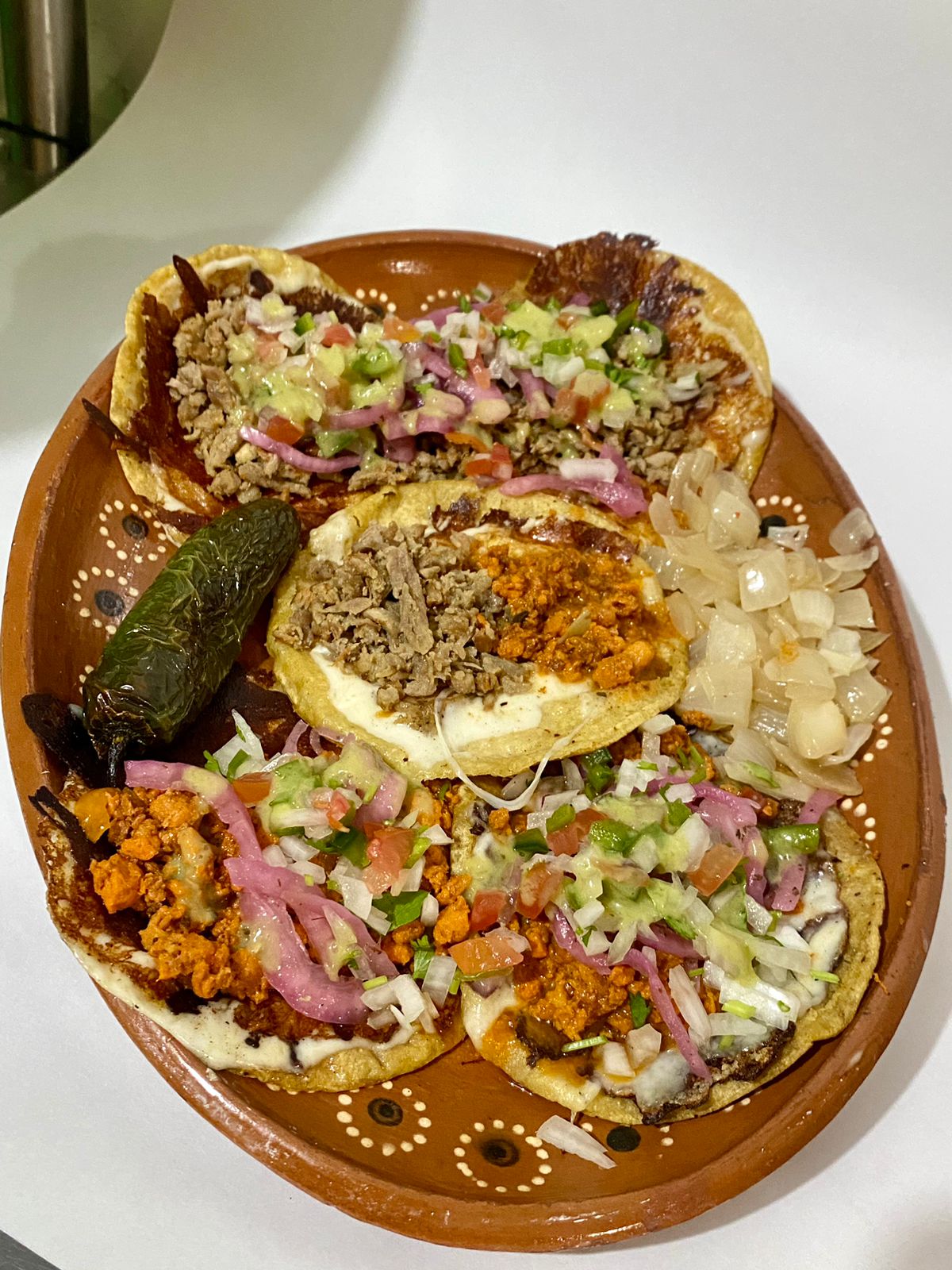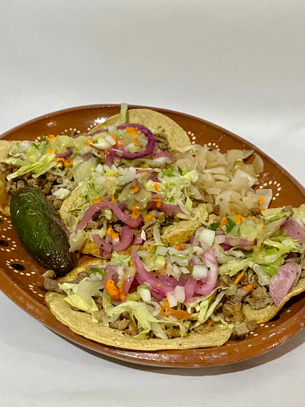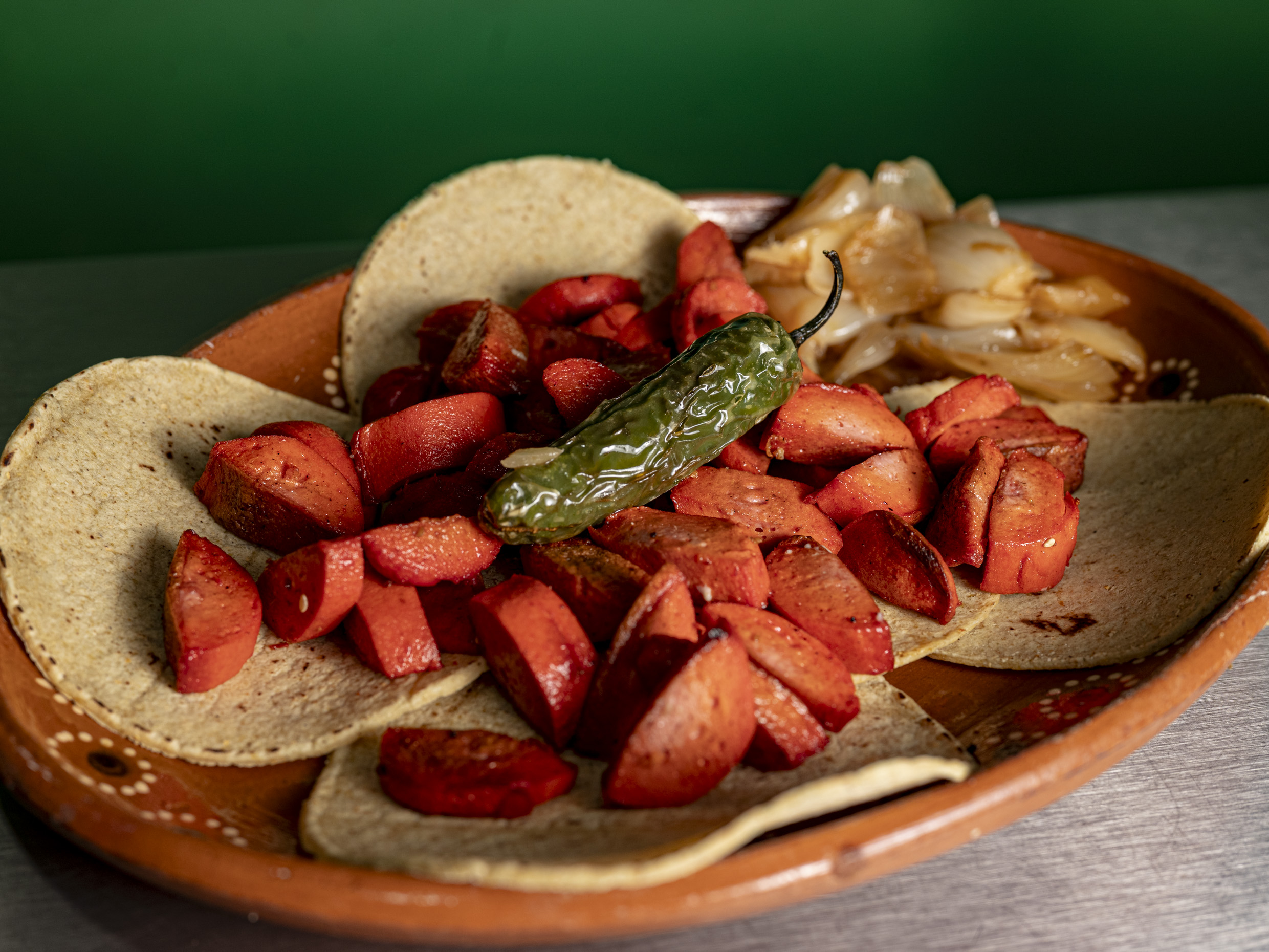 5 Tacos, cebolla asada y chile toreado.