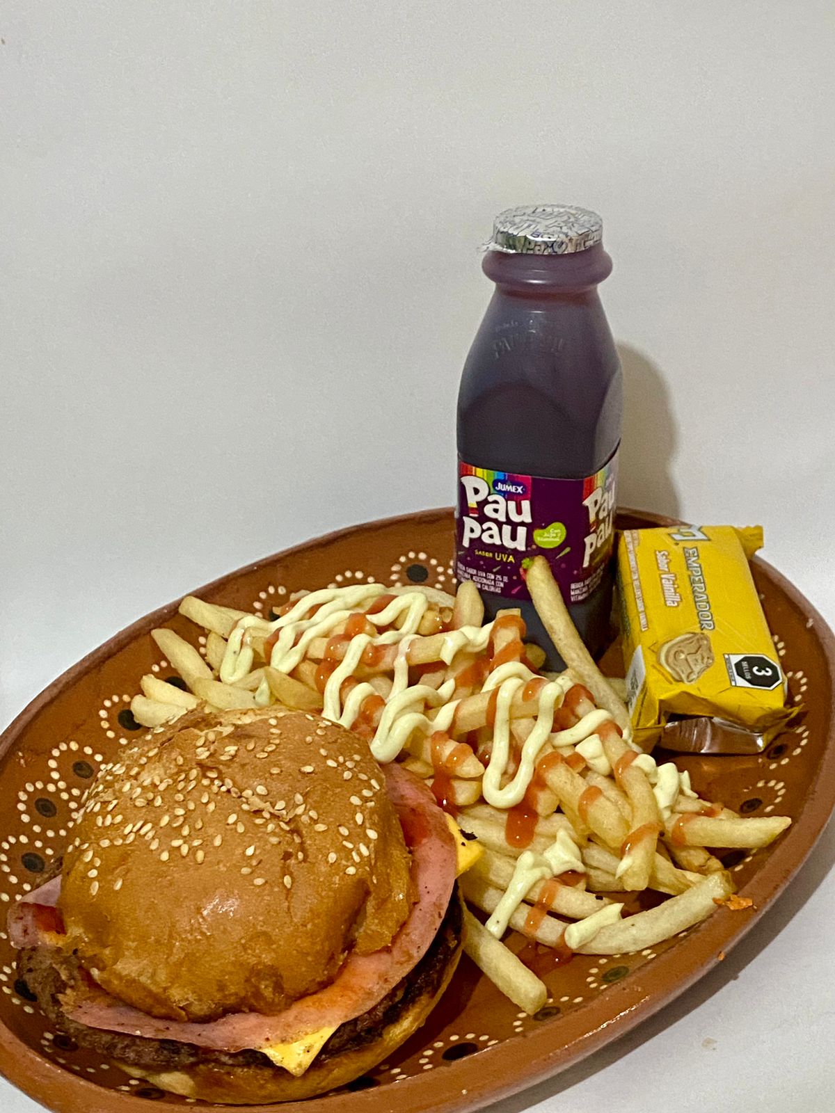 Una hamburguesa chica, media orden de papas, jugo y galleta.
