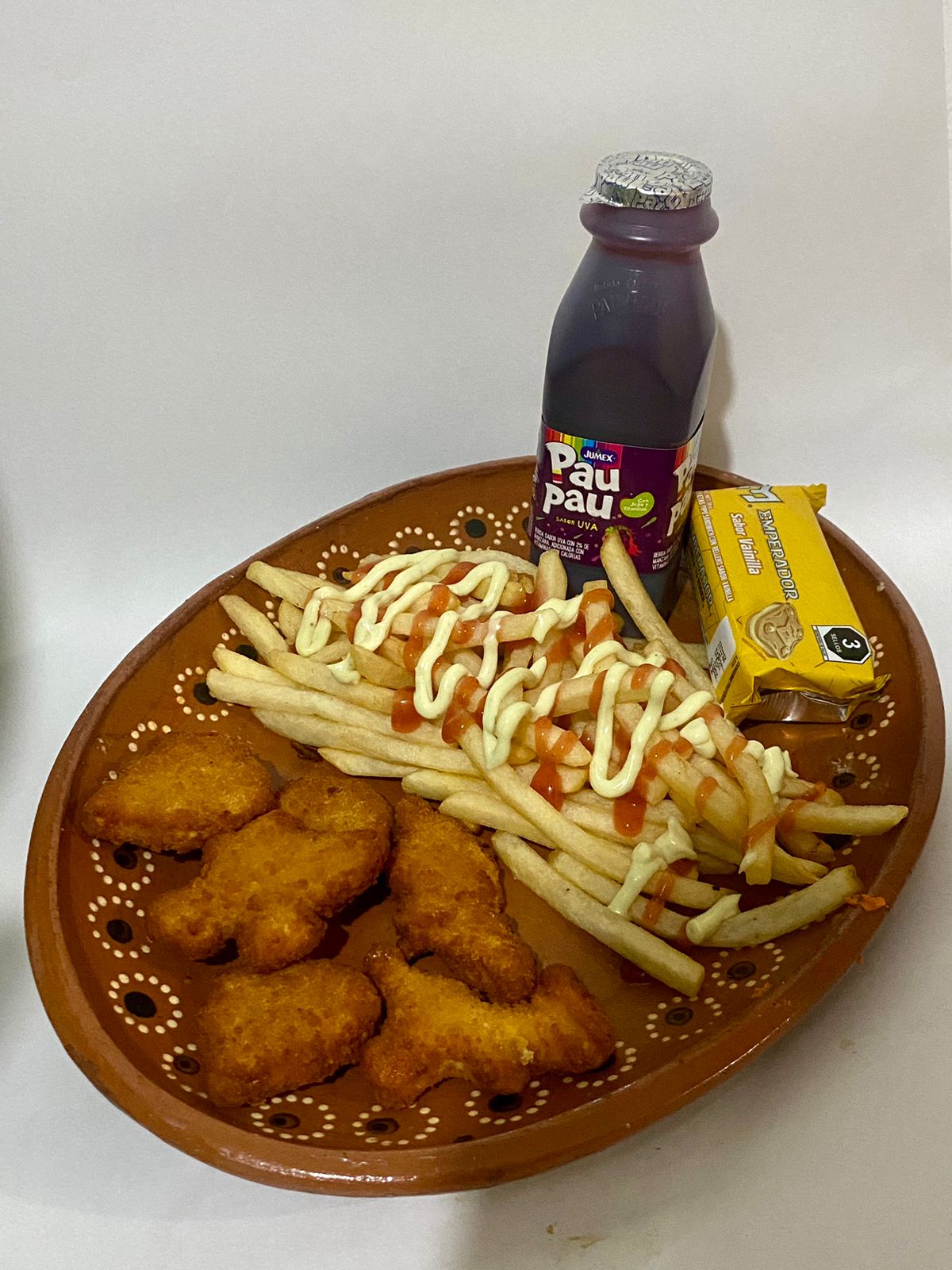 Nuggets 6 piezas, media orden de papas, jugo y galleta.