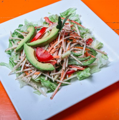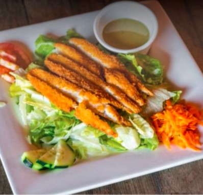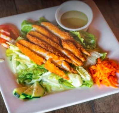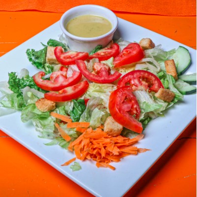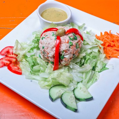 Cama de lechuga, fajitas de pescado y aderezo de la casa.