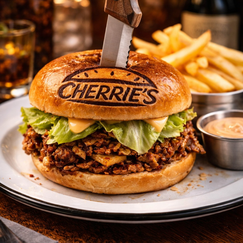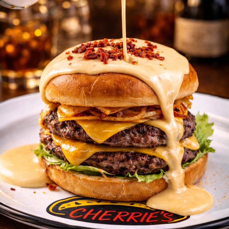 Bañada en queso, aros de cebolla, doble carne, queso amarillo y aderezo