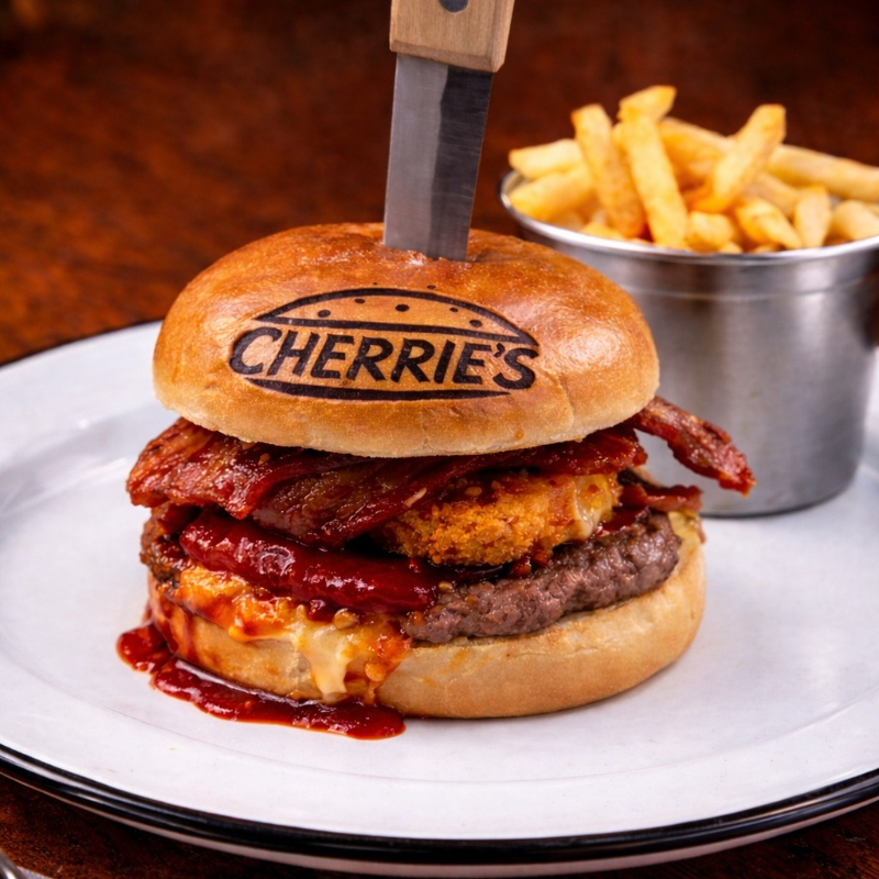 Carne de res, queso empanizado, tocino, queso amarillo, ensalada de col y pepinillos