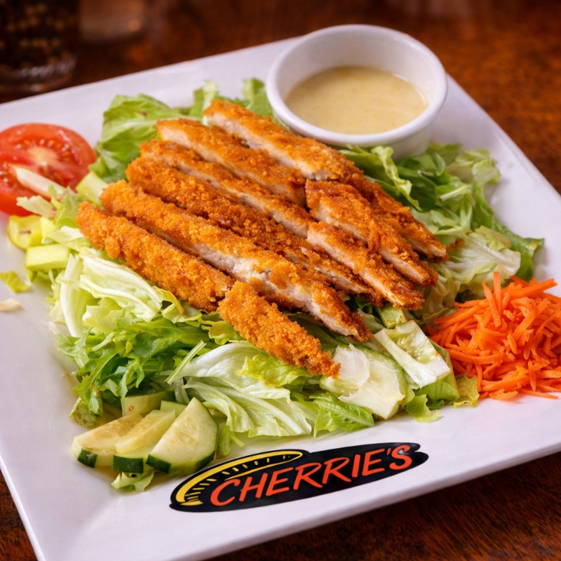 Con pollo a la plancha o empanizado, lechuga orejona, zanahoria, tomate y pepino