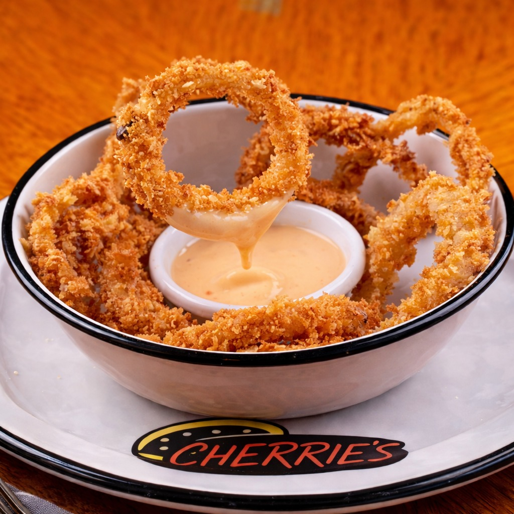 Crujientes aros de cebolla acompañados de nuestra salsa especial sriracha