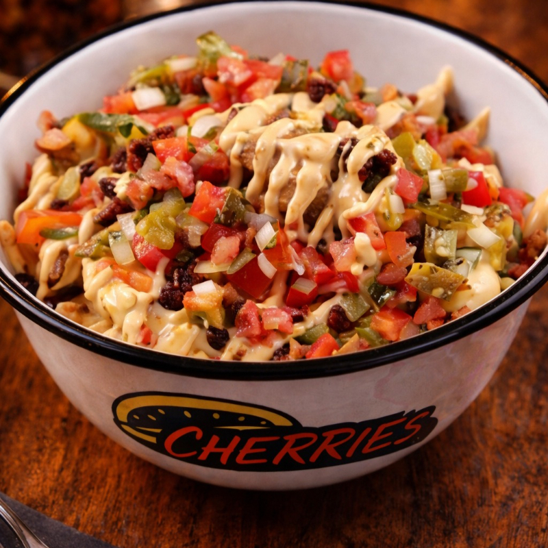 Papas fritas, salsa de queso, tocino crocante, cebolla crocante, chiles jalapeño, pepinillos picados y aderezo de sriracha