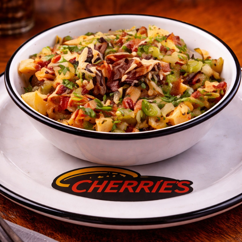 Papas a la francesa, salsa de queso, chorizo, salsa de carne,queso rallado, pico de pepinillo y cebolla caramelizada