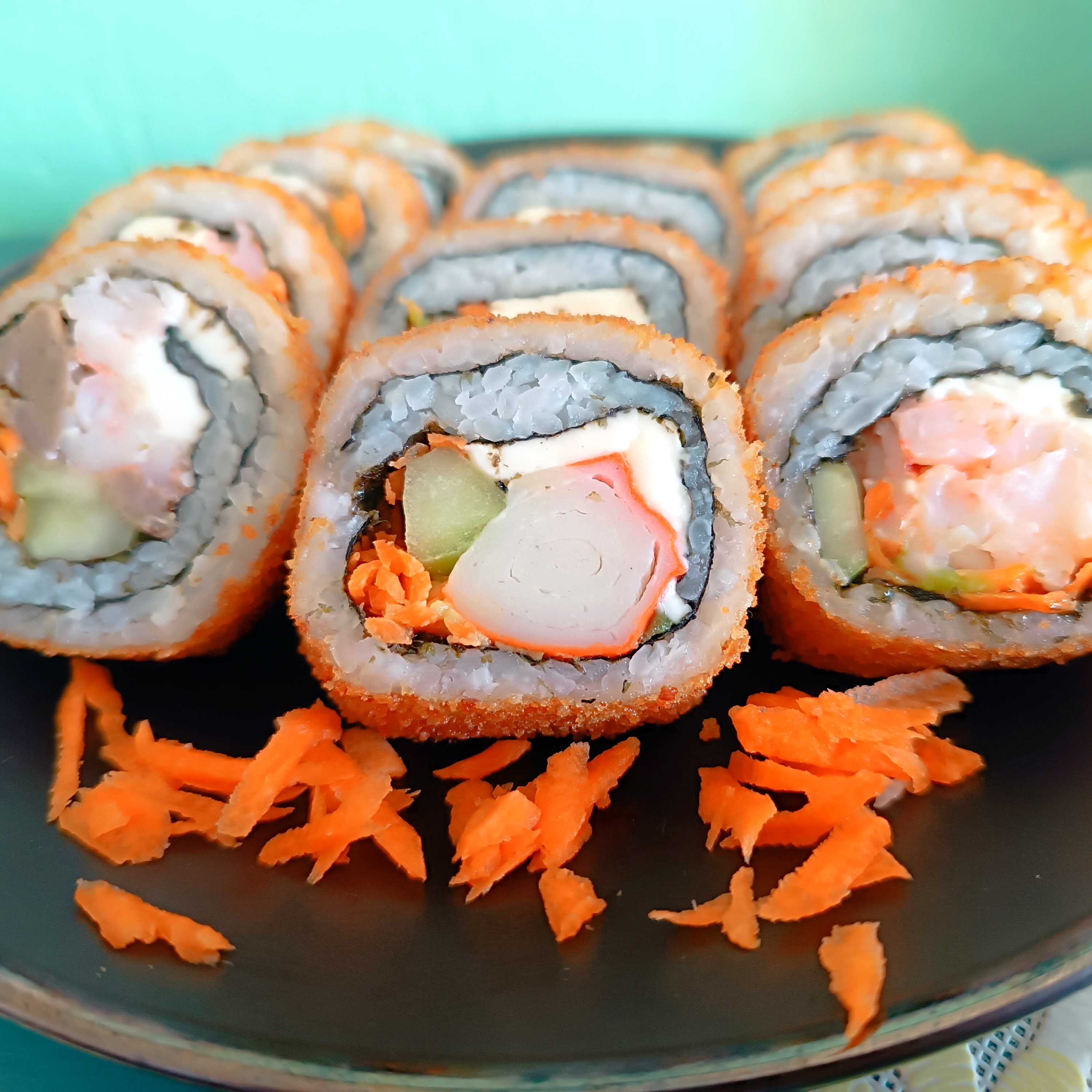 Disfruta un roll lleno de sabor con crujientes tiras de pollo empanizadas, acompañados de queso crema, pepino y zanahoria fresca. Cada bocado combina textura y frescura en un equilibrio perfecto 🤤✨ Un roll moderno, irresistible y lleno de crunch. ¡Pruébalo y enamórate! 🍣💥